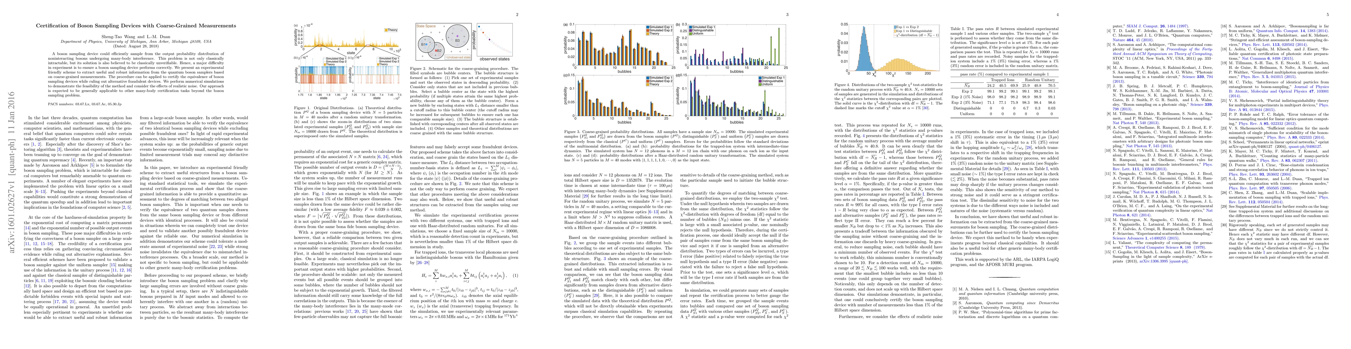 This paper proposes a method for certifying boson sampling devices using coarse-grained measurements, which allows for the extraction of useful information to verify the device's functionality while ruling out fraudulent alternatives. The approach is demonstrated through numerical simulations and is expected to be applicable to broader many-body certification tasks.