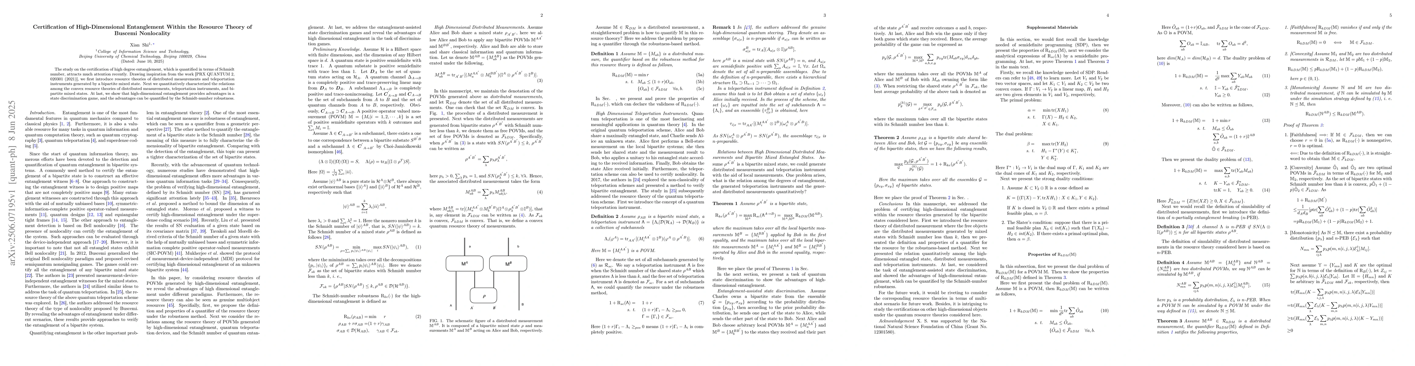 The study on the certification of high degree entanglement, which is quantified in terms of Schmidt number, attracts much attention recently. Drawing inspiration from the work [PRX QUANTUM 2, 020301 (2021)], we first introduce resource theories of distributed measurements and teleportation instruments generated by a bipartite mixed state. Next we quantitatively characterized the relations among the convex resource theories of distributed measurements, teleportation instruments, and bipartite mixed states. At last, we show that high-dimensional entanglement provides advantages in a state discrimination game, and the advantages can be quantified by the Schmidt-number robustness.