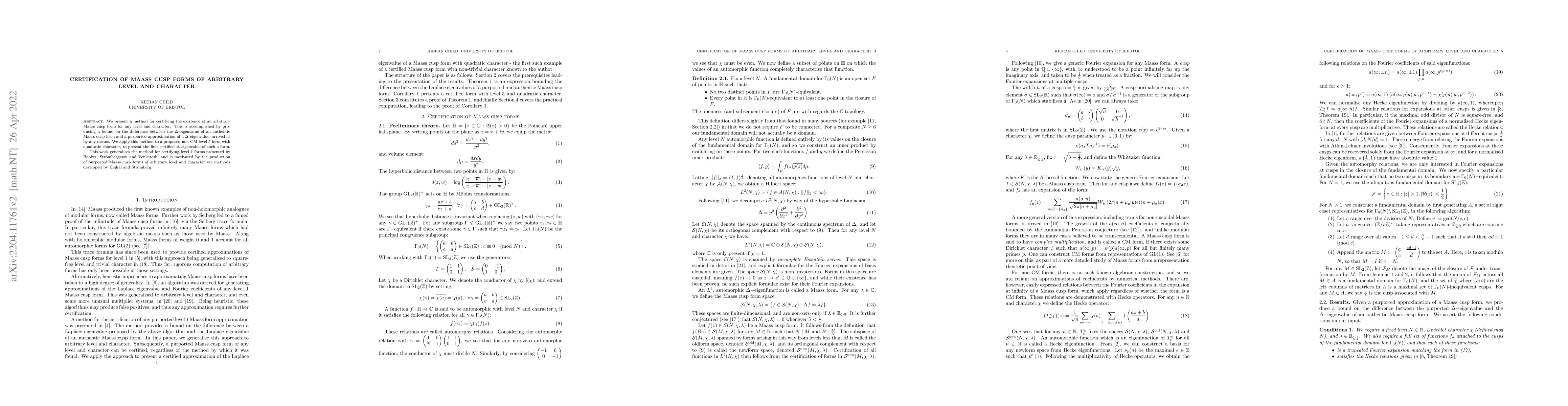 We present a method for certifying the existence of an arbitrary Maass cusp form for any level and character. This is accomplished by producing a bound on the difference between the $\Delta$-eigenvalue of an authentic Maass cusp form and a purported approximation of a $\Delta$-eigenvalue, arrived at by any means. We apply this method to a proposed non-CM level 5 form with quadratic character, to present the first certified $\Delta$-eigenvalue of such a form. This work generalises the method for certifying level 1 forms presented by Booker, Str\"ombergsson and Venkatesh, and is motivated by the production of purported Maass cusp forms of arbitrary level and character via methods developed by Hejhal and Str\"omberg.