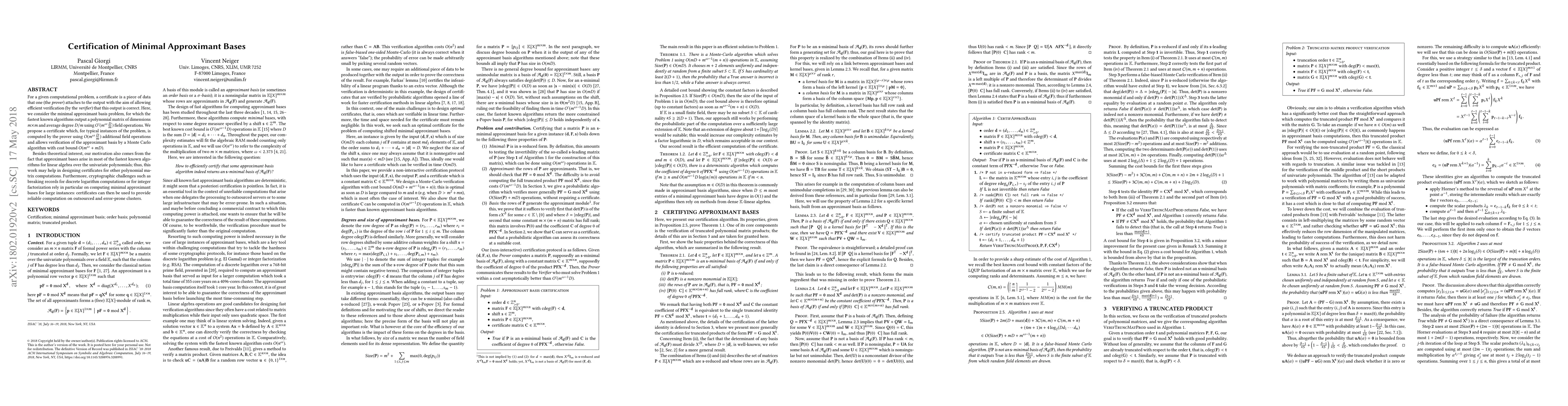 This paper proposes a certificate for verifying minimal approximant bases, which can be computed with $O(m^\omega \frac{D}{m})$ additional operations and allows efficient verification via a Monte Carlo algorithm. The work has implications for polynomial matrix computations and cryptographic applications, enhancing reliability in outsourced computations.
