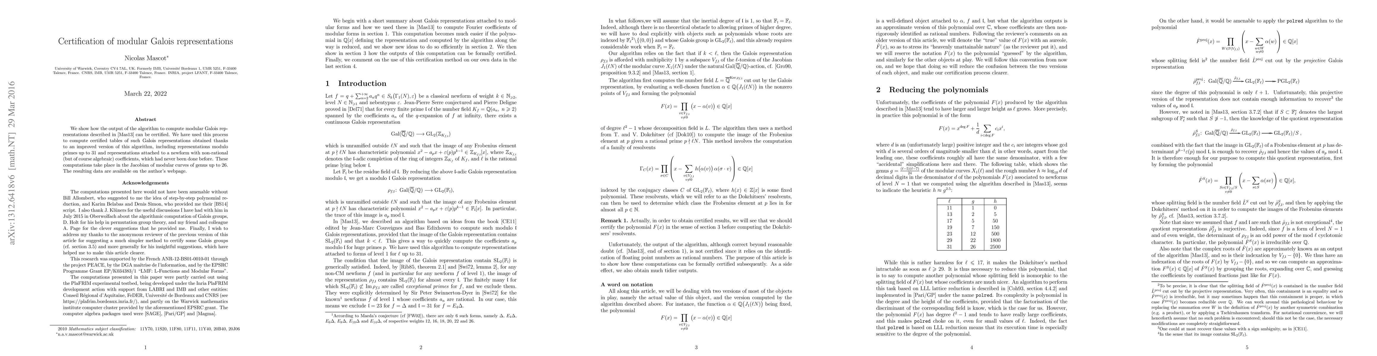 This paper certifies the output of an algorithm for computing modular Galois representations, providing certified tables for primes up to 31 and representations for a newform with non-rational coefficients. The computations occur in the Jacobian of modular curves of genus up to 26, with results available on the author's webpage.