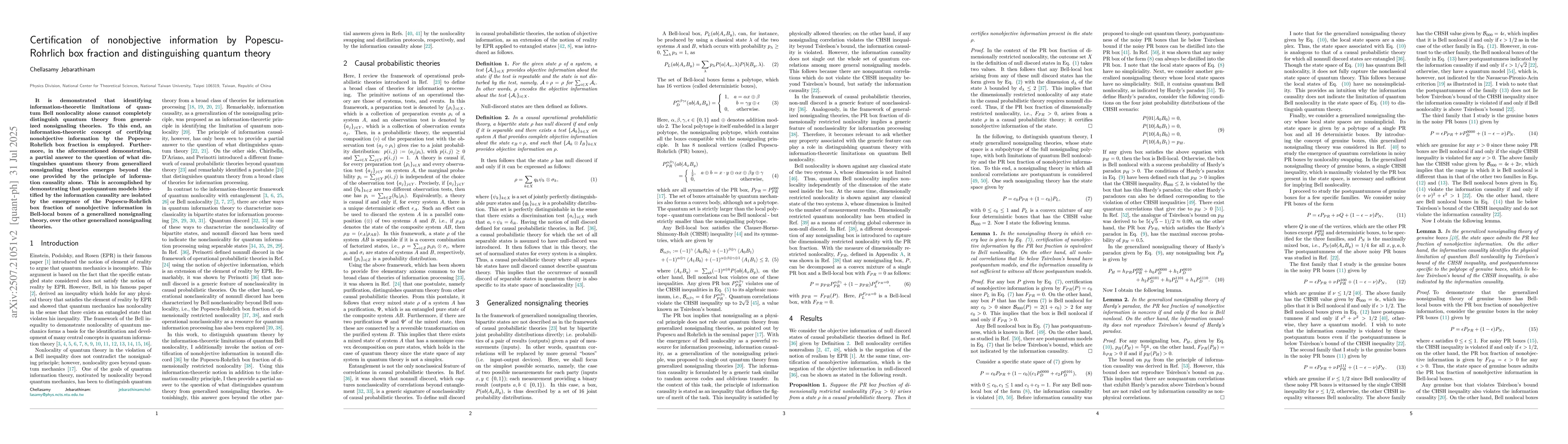 It is demonstrated that identifying information-theoretic limitations of quantum Bell nonlocality alone cannot completely distinguish quantum theory from generalized nonsignaling theories. To this end, an information-theoretic concept of certifying nonobjective information by the Popescu-Rohrlich box fraction is employed. Furthermore, in the aforementioned demonstration, a partial answer to the question of what distinguishes quantum theory from generalized nonsignaling theories emerges beyond the one provided by the principle of information causality alone. This is accomplished by demonstrating that postquantum models identified by the information causality are isolated by the emergence of the Popescu-Rohrlich box fraction of nonobjective information in Bell-local boxes of a generalized nonsignaling theory, over the two other generalized nonsignaling theories that have simplicial local state spaces.