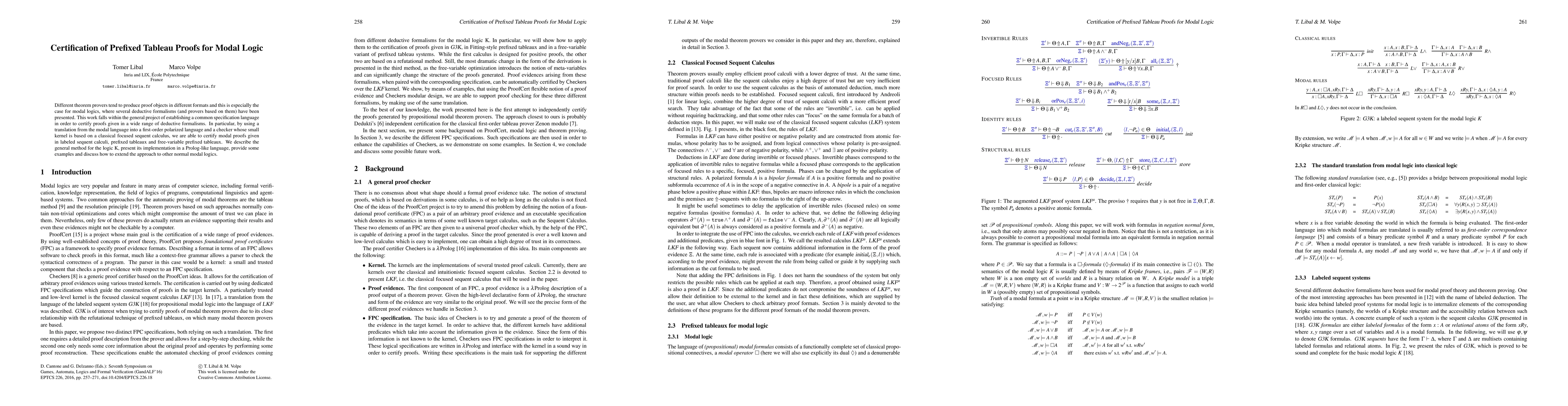 The translation from modal logic to a first-order polarized language and the checker based on a classical focused sequent calculus for certifying prefixed tableau proofs.