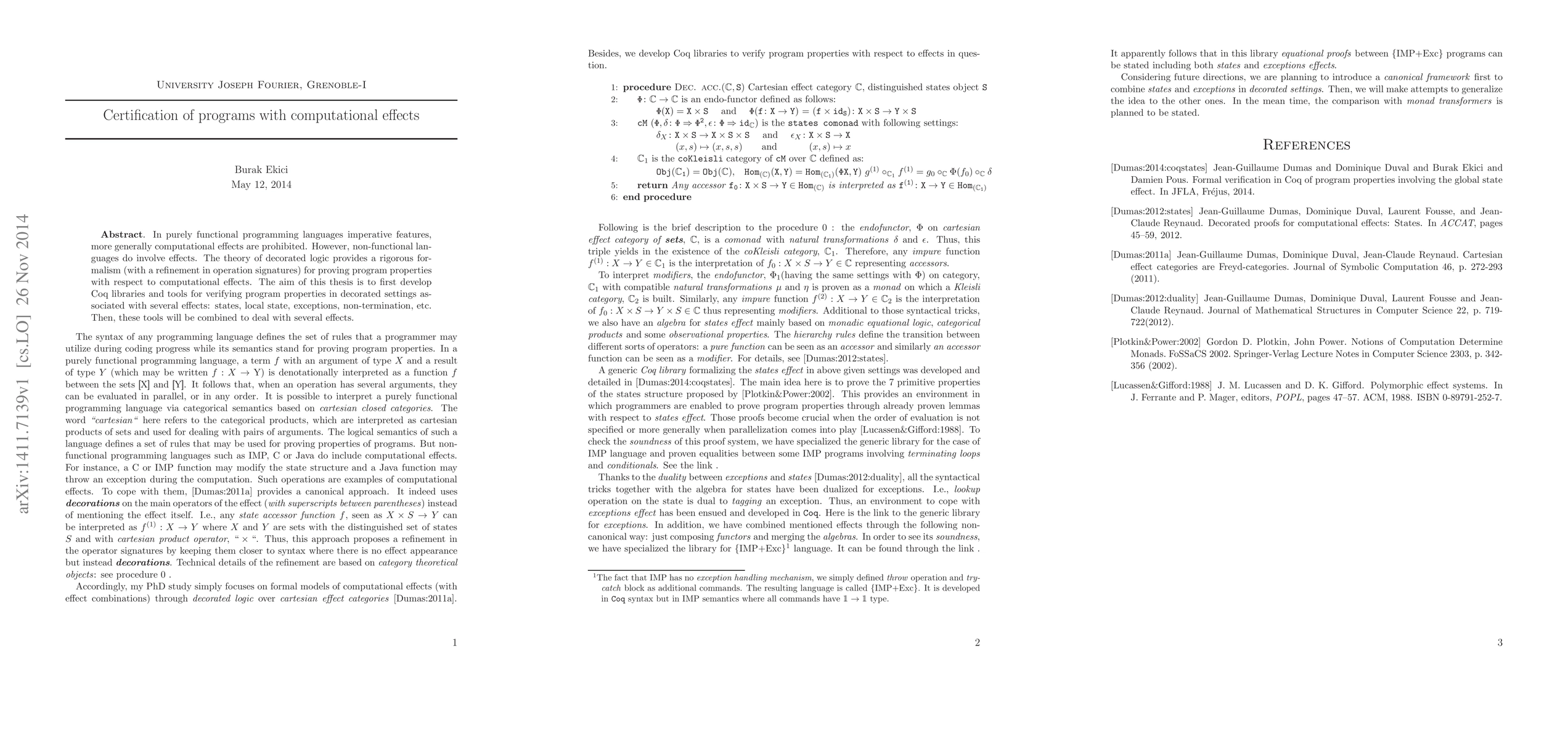 This research introduces Coq libraries and tools for verifying program properties considering various computational effects like states, local state, exceptions, and non-termination. The aim is to combine these tools for dealing with multiple effects, advancing program certification in non-purely functional languages.
