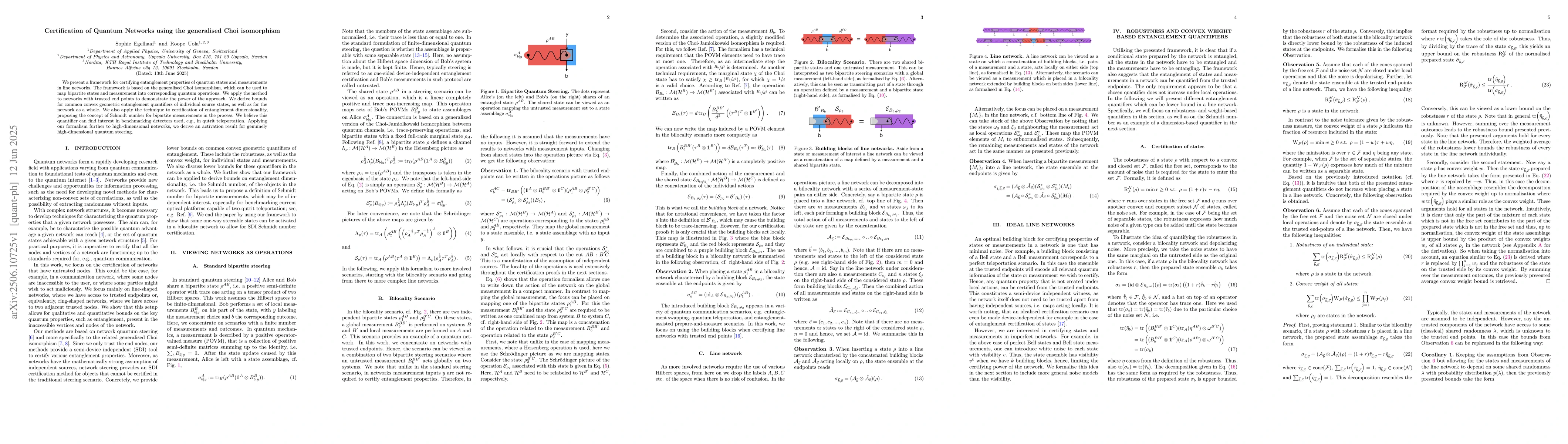 We present a framework for certifying entanglement properties of quantum states and measurements in line networks. The framework is based on the generalised Choi isomorphism, which can be used to map bipartite states and measurements into corresponding quantum operations. We apply the method to networks with trusted end points to demonstrate the power of the approach. We derive bounds for common convex geometric entanglement quantifiers of individual source states, as well as for the network as a whole. We also apply the technique to certification of entanglement dimensionality, proposing the concept of Schmidt number for bipartite measurements in the process. We believe this quantifier can find interest in benchmarking detectors used, e.g. in qutrit teleportation. Applying our formalism further to high-dimensional networks, we derive an activation result for genuinely high-dimensional quantum steering.