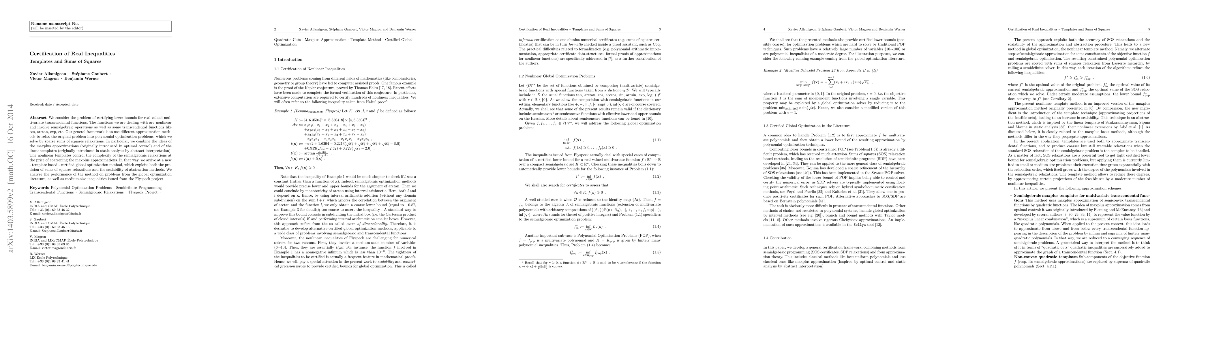 The paper presents a novel method for certifying lower bounds of real-valued multivariate transcendental functions using sparse sums of squares relaxations, combining maxplus estimators and linear templates.