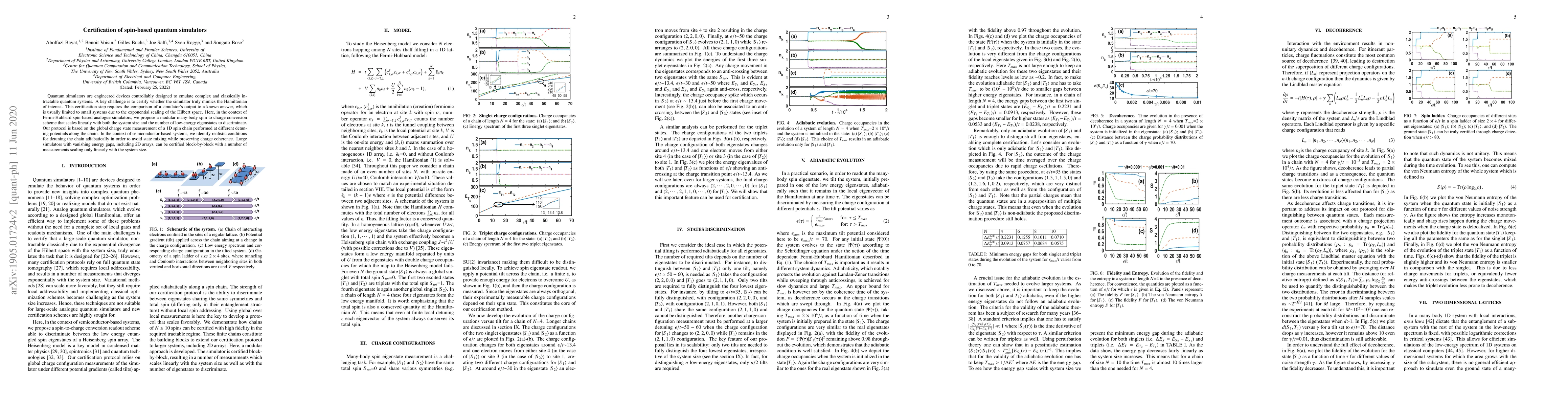 This paper proposes a scalable linear certification protocol for spin-based quantum simulators, specifically for Fermi-Hubbard models, using a modular many-body spin-to-charge conversion scheme. The method involves global charge state measurements along a 1D spin chain under varying detuning potentials, enabling certification of large systems, including 2D arrays, with linear scaling in measurements.