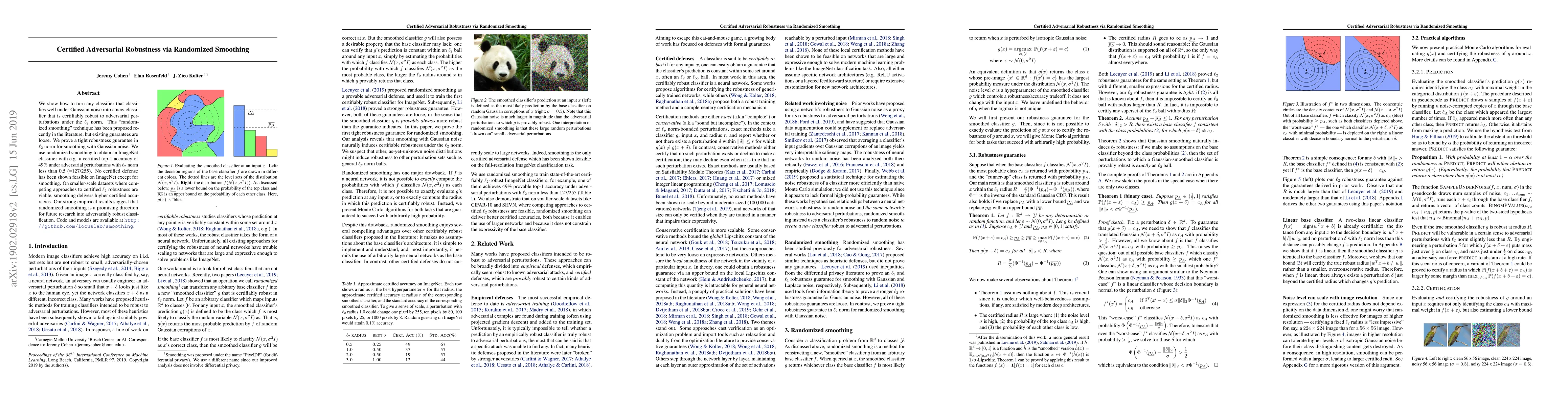 This paper presents a method for achieving certified adversarial robustness using randomized smoothing, which transforms existing classifiers into certifiably robust ones under $\ell_2$ norm. The authors provide tight $\ell_2$ robustness guarantees and demonstrate its effectiveness on ImageNet, achieving a certified top-1 accuracy of 49% under adversarial perturbations.