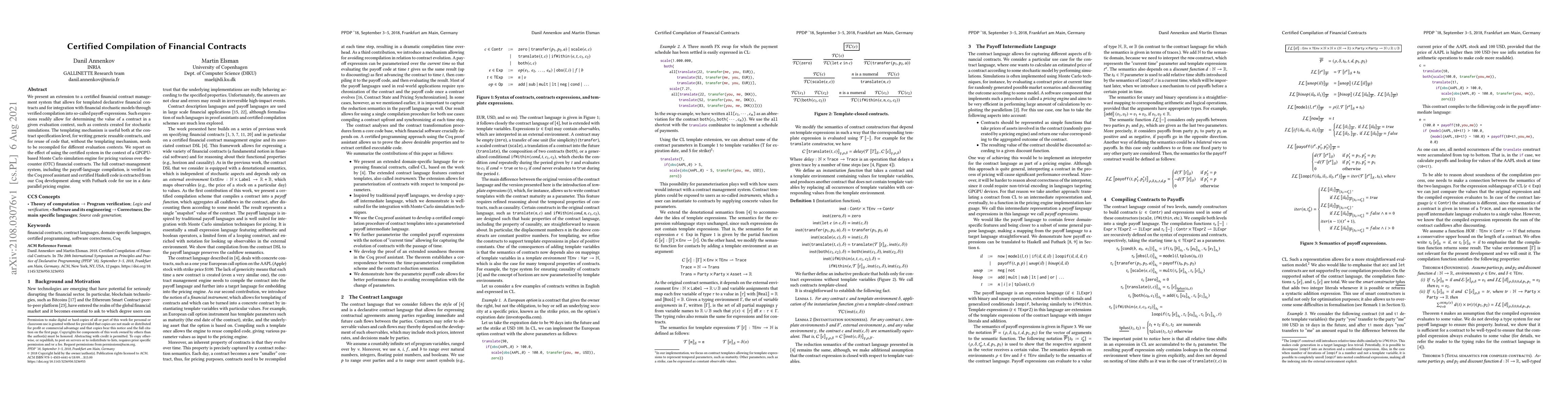 This research introduces a certified financial contract management system with templated, declarative contracts and verified compilation into payoff-expressions. The system facilitates reusable contracts and code across various evaluation contexts, such as stochastic simulations. It's demonstrated with a GPGPU-based Monte Carlo simulation engine for pricing OTC financial contracts, with the full system verified in Coq and certified Haskell/Futhark code extracted for data-parallel pricing.