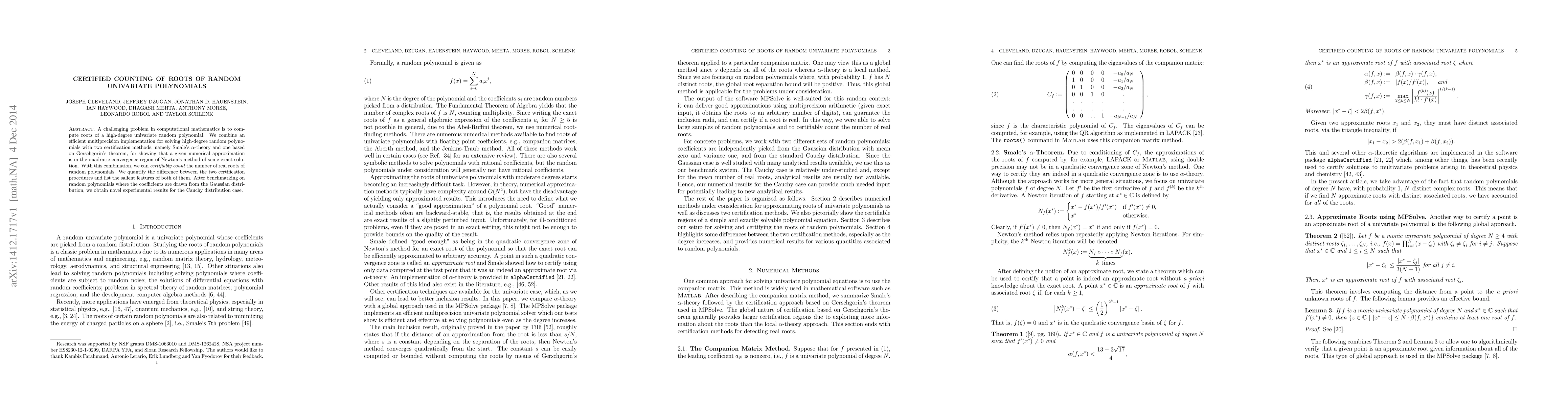 A challenging problem in computational mathematics is to compute roots of a high-degree univariate random polynomial. We combine an efficient multiprecision implementation for solving high-degree random polynomials with two certification methods, namely Smale's $\alpha$-theory and one based on Gerschgorin's theorem, for showing that a given numerical approximation is in the quadratic convergence region of Newton's method of some exact solution. With this combination, we can certifiably count the number of real roots of random polynomials. We quantify the difference between the two certification procedures and list the salient features of both of them. After benchmarking on random polynomials where the coefficients are drawn from the Gaussian distribution, we obtain novel experimental results for the Cauchy distribution case.