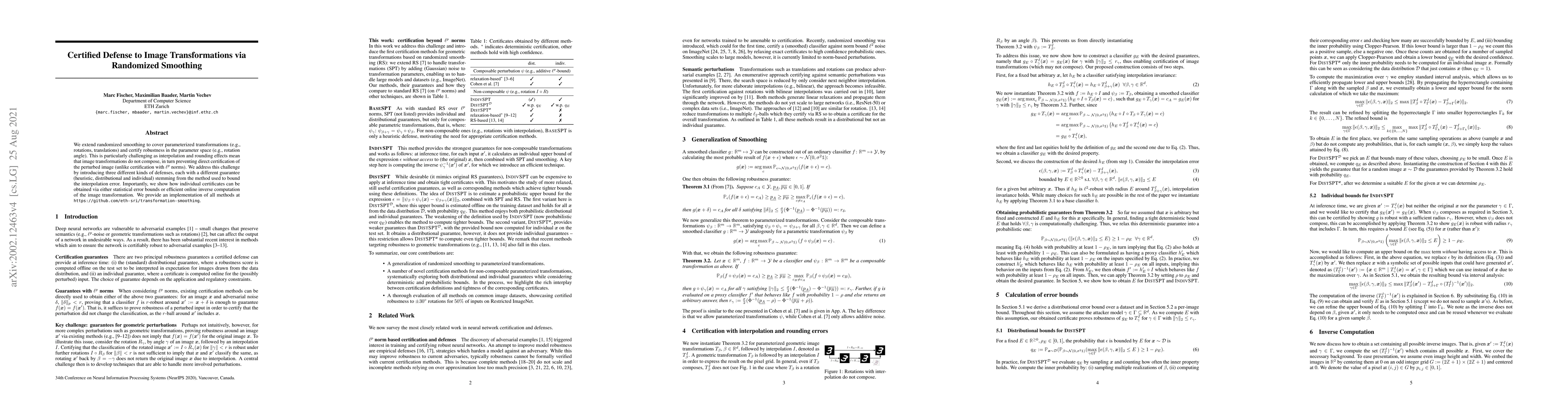 This paper extends randomized smoothing to certify robustness against parameterized image transformations like rotations and translations. It introduces three types of defenses to address the non-compositional nature of such transformations, offering heuristic, distributional, and individual guarantees, and provides an implementation for these methods.