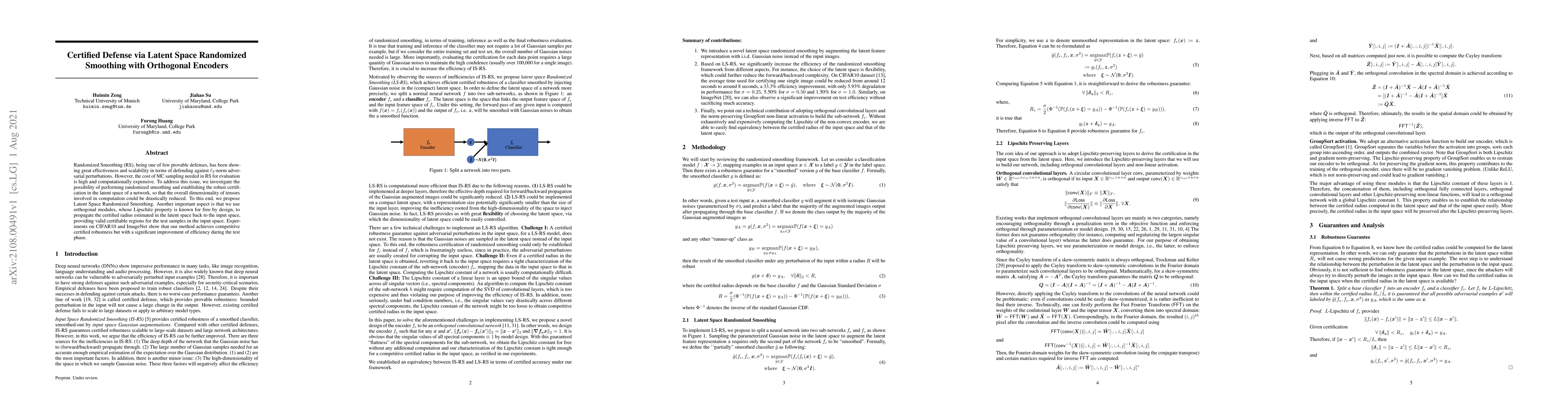 This paper proposes Latent Space Randomized Smoothing to reduce the computational cost of Randomized Smoothing by performing it in the latent space of a network, using orthogonal encoders to efficiently propagate certified robustness back to the input space. Experiments demonstrate competitive certified robustness with significant efficiency improvements on CIFAR10 and ImageNet.