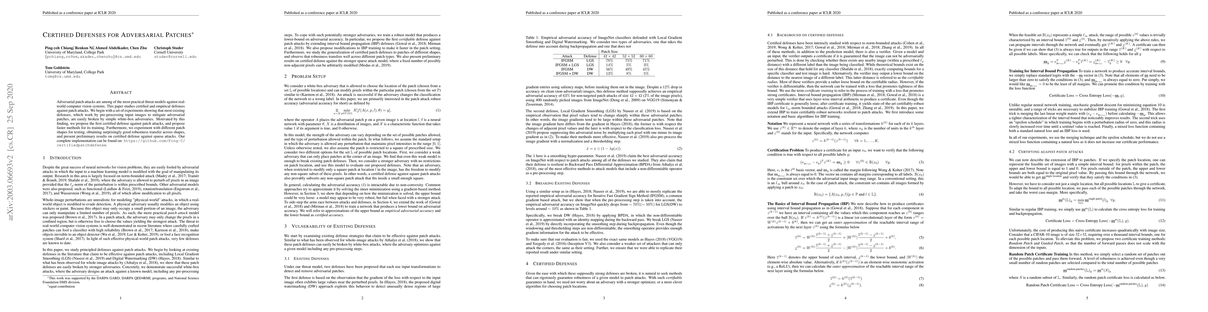 This paper investigates certified and empirical defenses against adversarial patch attacks in computer vision systems, demonstrating that existing defenses are easily defeated by simple adversaries. The authors propose the first certified defense, along with faster training methods, and show robust transfer across different patch shapes, with preliminary results on defending against sparse attacks. Implementation details are available on GitHub.