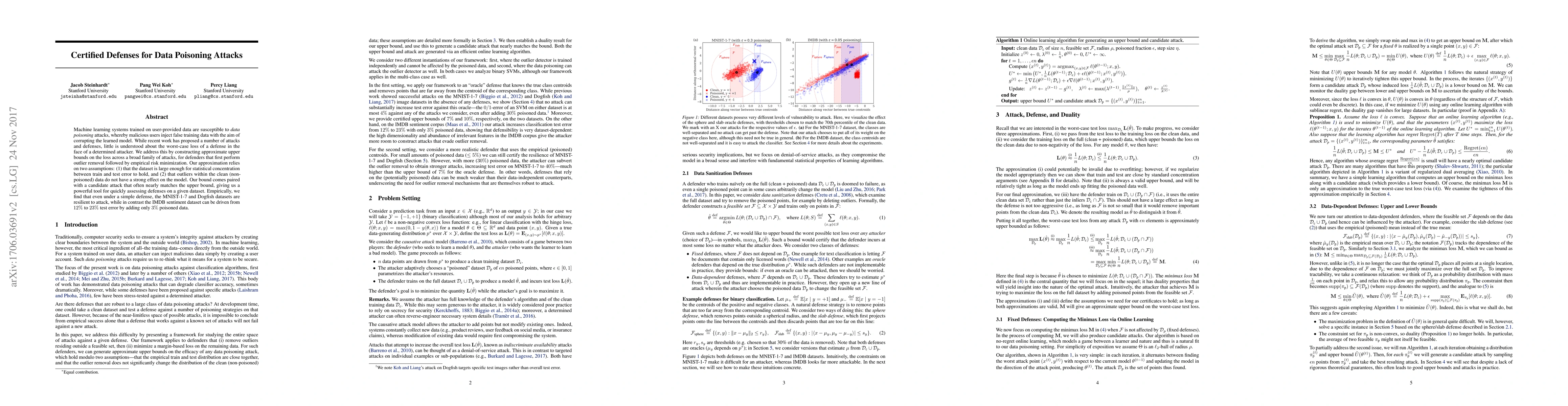 Machine learning systems trained on user-provided data are susceptible to data poisoning attacks, whereby malicious users inject false training data with the aim of corrupting the learned model. While recent work has proposed a number of attacks and defenses, little is understood about the worst-case loss of a defense in the face of a determined attacker. We address this by constructing approximate upper bounds on the loss across a broad family of attacks, for defenders that first perform outlier removal followed by empirical risk minimization. Our approximation relies on two assumptions: (1) that the dataset is large enough for statistical concentration between train and test error to hold, and (2) that outliers within the clean (non-poisoned) data do not have a strong effect on the model. Our bound comes paired with a candidate attack that often nearly matches the upper bound, giving us a powerful tool for quickly assessing defenses on a given dataset. Empirically, we find that even under a simple defense, the MNIST-1-7 and Dogfish datasets are resilient to attack, while in contrast the IMDB sentiment dataset can be driven from 12% to 23% test error by adding only 3% poisoned data.