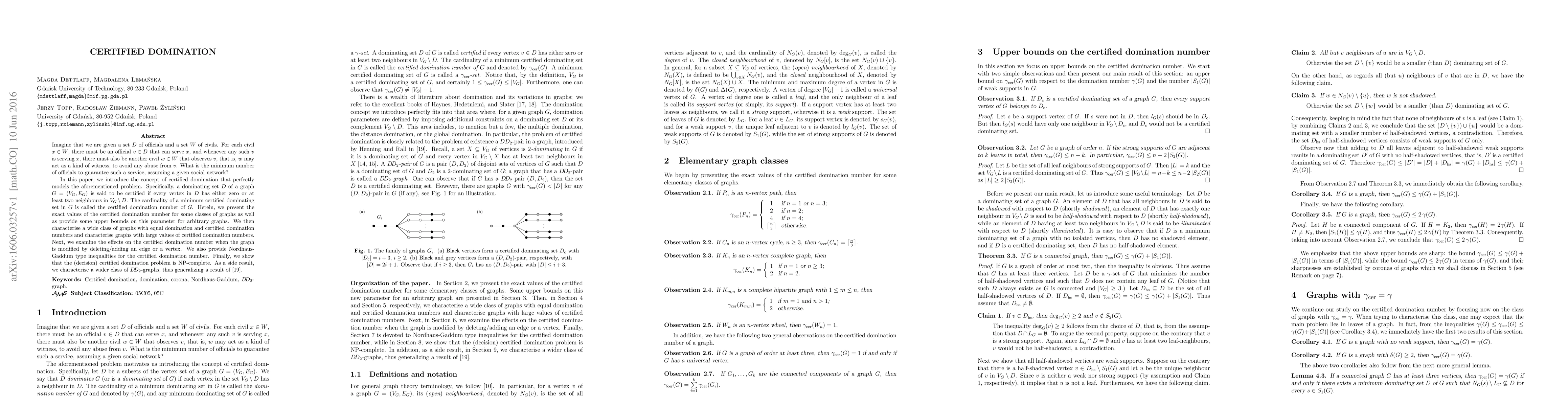 This paper introduces the concept of certified domination in graphs, where a dominating set must have each member connected to either zero or at least two non-members to act as a witness against abuse. The study provides exact values and bounds for the certified domination number in various graph classes and proves the NP-completeness of the certified domination decision problem.