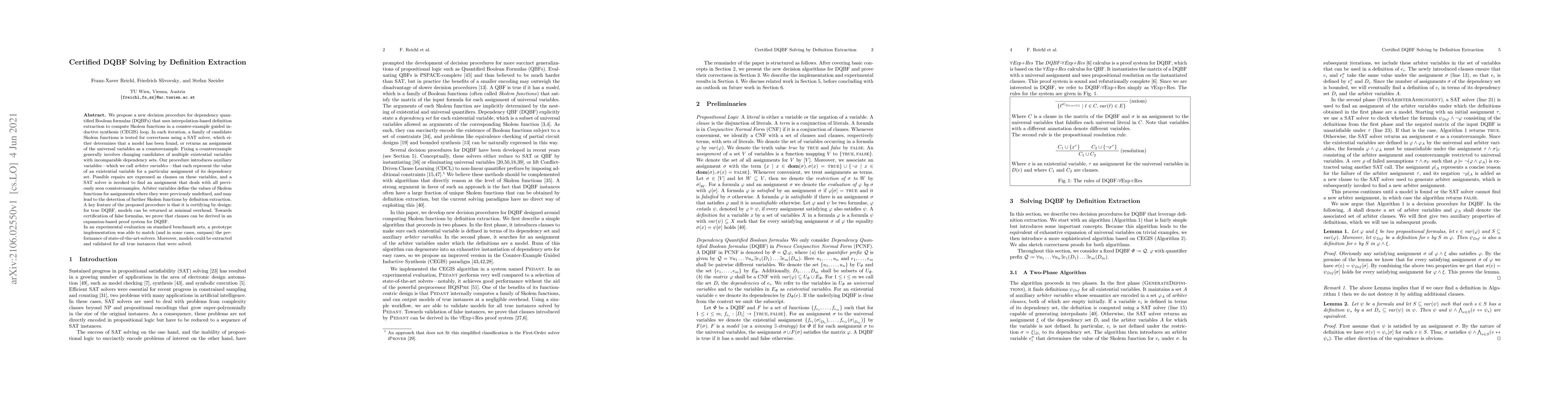 We propose a new decision procedure for dependency quantified Boolean formulas (DQBF) that uses interpolation-based definition extraction to compute Skolem functions in a counter-example guided inductive synthesis (CEGIS) loop. In each iteration, a family of candidate Skolem functions is tested for correctness using a SAT solver, which either determines that a model has been found, or returns an assignment of the universal variables as a counterexample. Fixing a counterexample generally involves changing candidates of multiple existential variables with incomparable dependency sets. Our procedure introduces auxiliary variables -- which we call arbiter variables -- that each represent the value of an existential variable for a particular assignment of its dependency set. Possible repairs are expressed as clauses on these variables, and a SAT solver is invoked to find an assignment that deals with all previously seen counterexamples. Adding arbiter variables defines the values of Skolem functions for assignments where they were previously undefined, and may lead to the detection of Skolem functions by definition extraction in subsequent iterations. A key feature of the proposed procedure is that it is certifying by design: for true DQBF, models can be returned at minimal overhead. Towards certification of false formulas, we prove that clauses can be derived in an expansion-based proof system for DQBF. In an experimental evaluation on standard benchmark sets, an implementation was able to match (and in some cases, surpass) the performance of state-of-the-art DQBF solvers. Moreover, models could be generated and validated for all true instances that were solved.