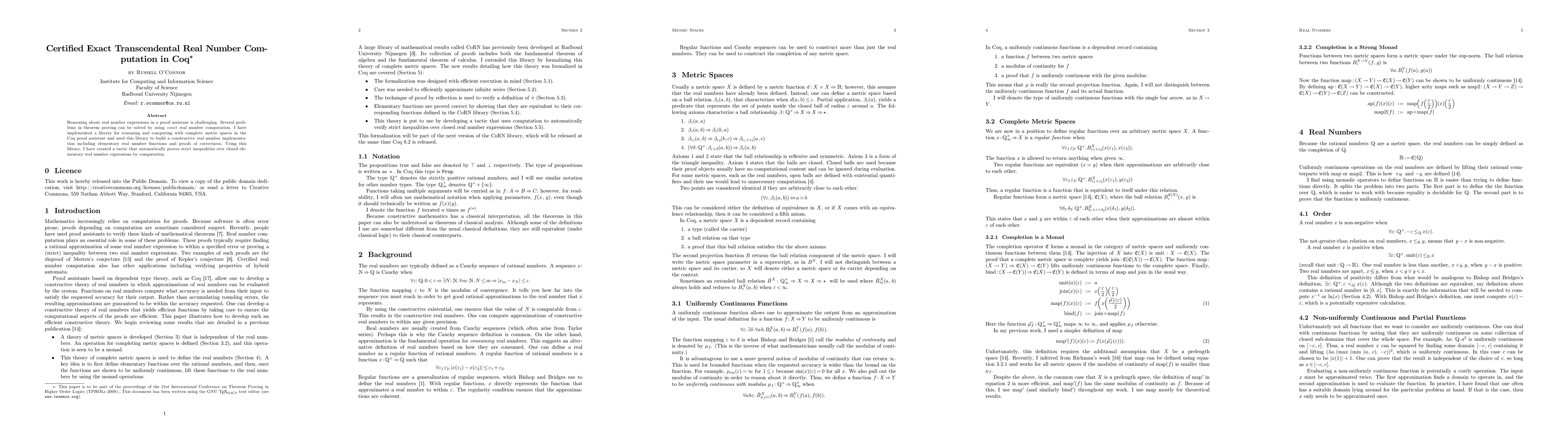 This paper presents a library for the Coq proof assistant that supports exact computation and reasoning with real numbers in complete metric spaces. The authors demonstrate its use in constructing a robust real number system and developing a tactic for automatically proving strict inequalities.
