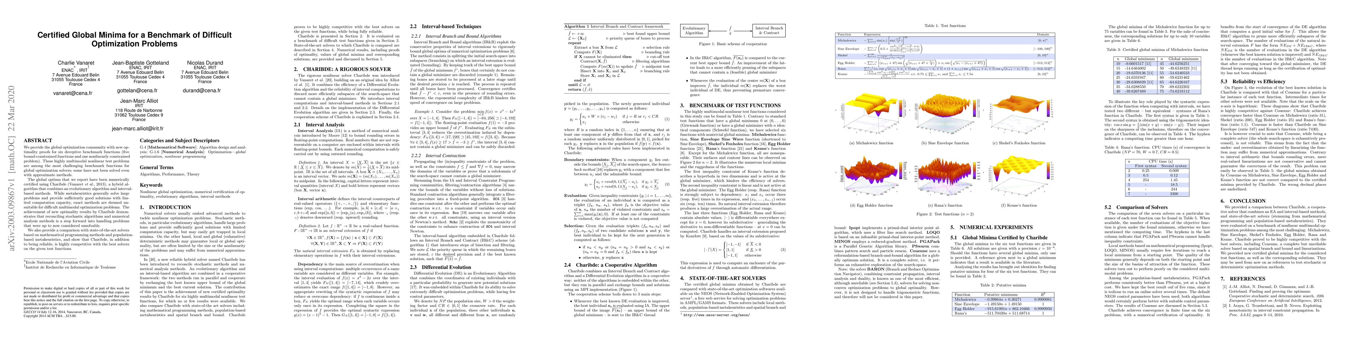 This paper presents new global optimality proofs for six challenging benchmark functions, solved using Charibde, a hybrid algorithm combining evolutionary and interval-based methods. The results demonstrate that combining stochastic and numerical analysis methods can tackle previously unsolvable optimization problems.