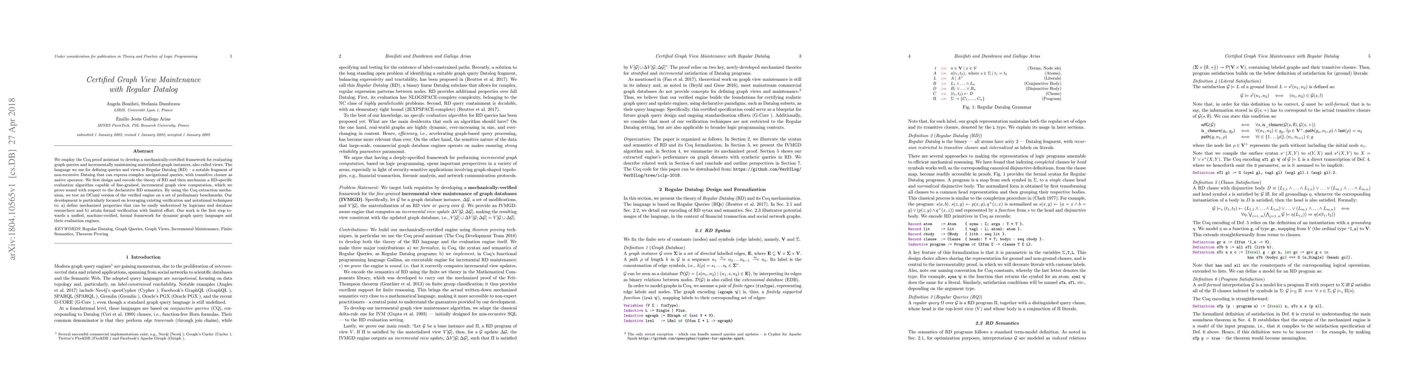 Researchers developed a mechanically-certified framework for evaluating graph queries using Regular Datalog, enabling formal verification with limited effort, and creating a unified machine-verified framework for dynamic graph query languages.