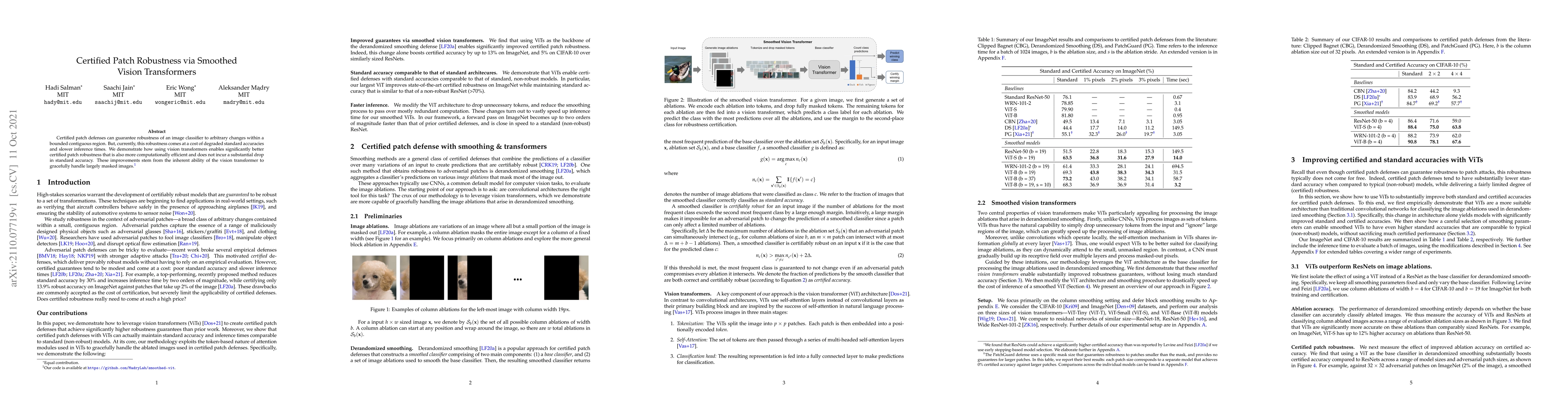 This research paper proposes using vision transformers to achieve certified patch robustness in image classifiers, demonstrating improved efficiency and less reduction in standard accuracy compared to traditional methods. The vision transformer's ability to manage masked images contributes to these enhancements.