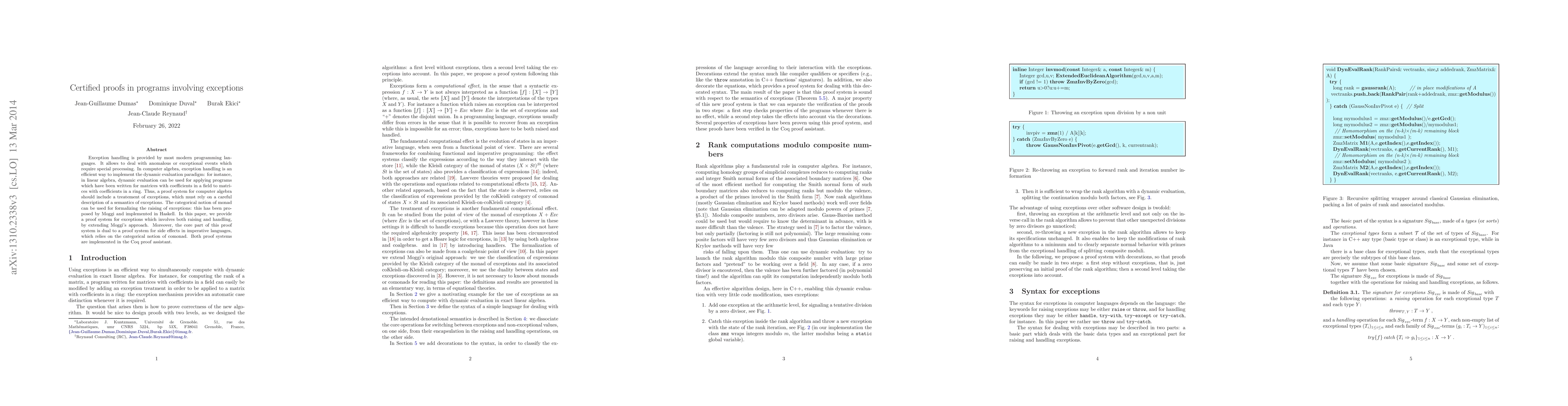 This paper extends Moggi's categorical monad approach to formalize exception handling in computer algebra, providing a proof system that includes both raising and handling exceptions. It also establishes a dual relationship between this exception handling system and a proof system for side effects, implemented in the Coq proof assistant.