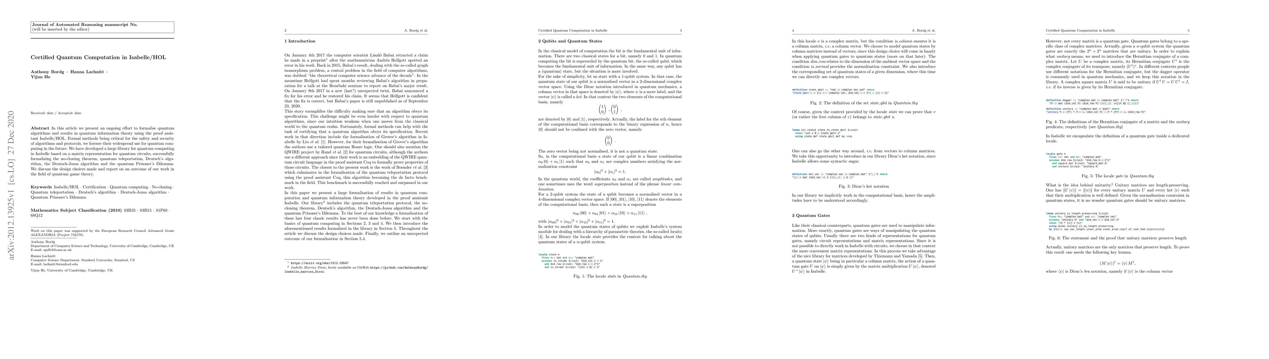 The research formalizes quantum algorithms and results in quantum information theory using the Isabelle/HOL proof assistant, developing a large library for quantum computing with matrix representation for quantum circuits.