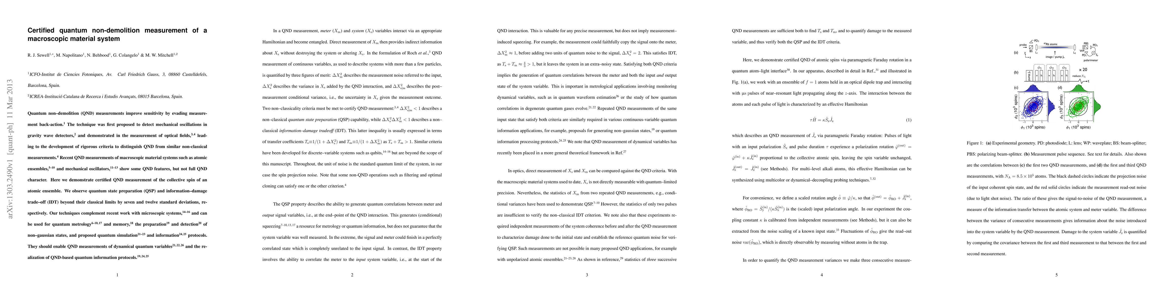Quantum non-demolition (QND) measurements improve sensitivity by evading measurement back-action. The technique was first proposed to detect mechanical oscillations in gravity wave detectors,and demonstrated in the measurement of optical fields, leading to the development of rigorous criteria to distinguish QND from similar non-classical measurements. Recent QND measurements of macroscopic material systems such as atomic ensembles, and mechanical oscillators, show some QND features, but not full QND character. Here we demonstrate certified QND measurement of the collective spin of an atomic ensemble. We observe quantum state preparation (QSP) and information-damage trade-off (IDT) beyond their classical limits by seven and twelve standard deviations, respectively. Our techniques complement recent work with microscopic systems, and can be used for quantum metrology and memory, the preparation and detection of non-gaussian states, and proposed quantum simulation and information protocols. They should enable QND measurements of dynamical quantum variables and the realization of QND-based quantum information protocols.