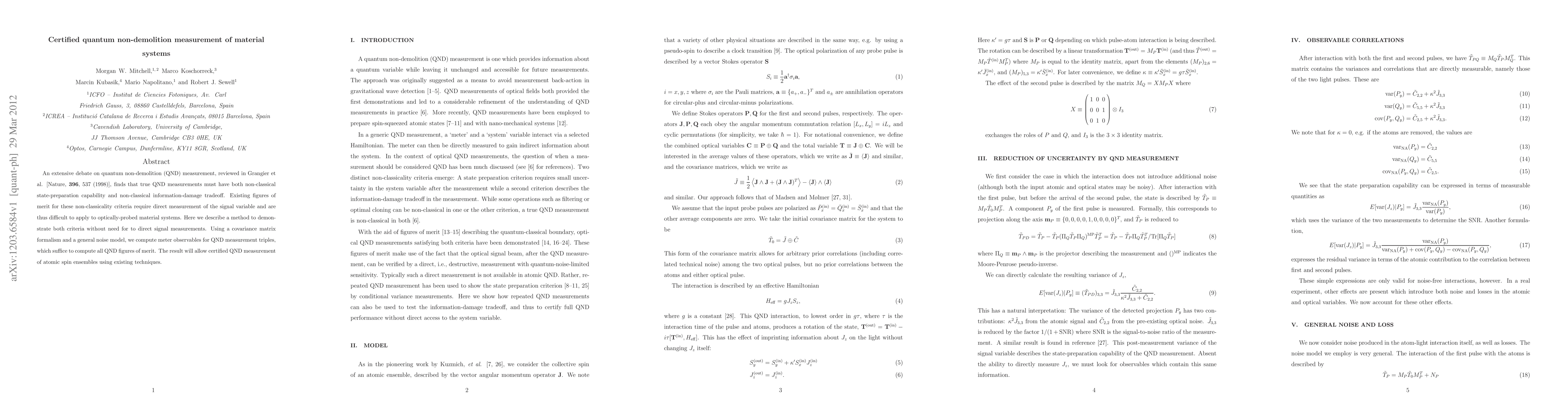 This paper proposes a method to certify quantum non-demolition (QND) measurements in material systems without direct signal measurements, utilizing a covariance matrix formalism and general noise models to compute meter observables for QND measurement triples. This approach enables certified QND measurement of atomic spin ensembles using current techniques.