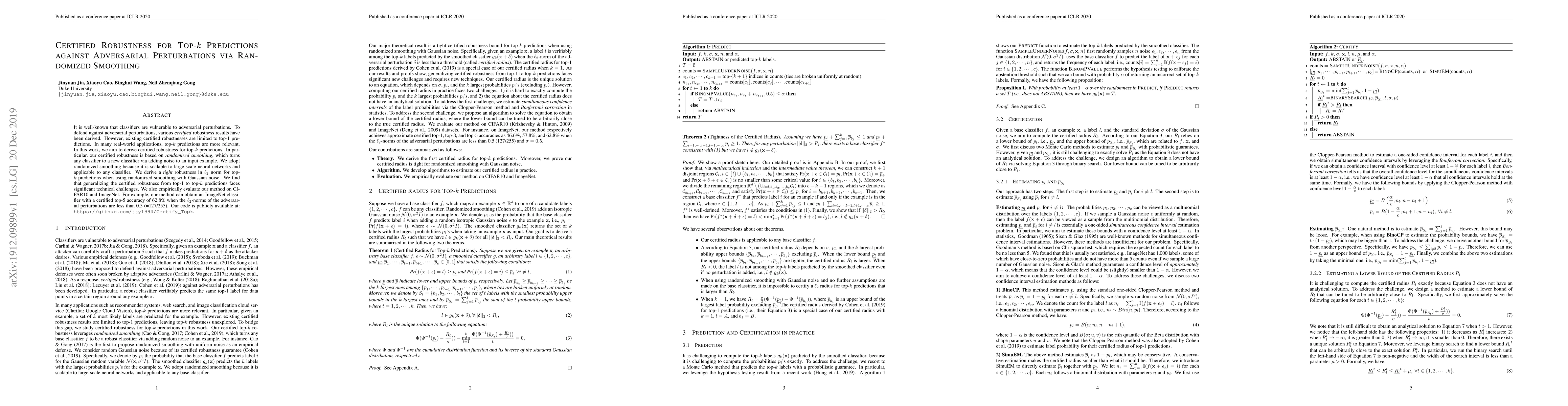 This paper proposes a method to derive certified robustness for top-$k$ predictions using randomized smoothing, addressing the limitation of existing certified robustness for top-1 predictions. The authors demonstrate scalability and effectiveness through empirical evaluation on CIFAR10 and ImageNet, achieving a certified top-5 accuracy of 62.8% under specified $\ell_2$ perturbation constraints.