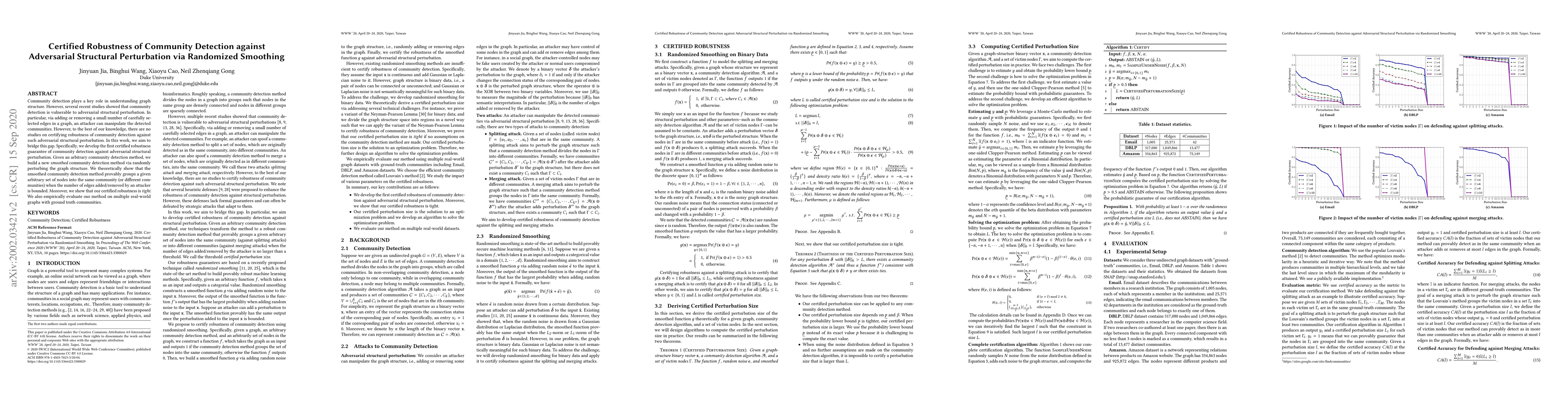 This paper introduces a new method to certify the robustness of community detection against adversarial structural perturbations. It employs randomized smoothing to provide a provable guarantee that community detection results will not change when a limited number of edges are added or removed, thus enhancing the security and reliability of community detection algorithms.