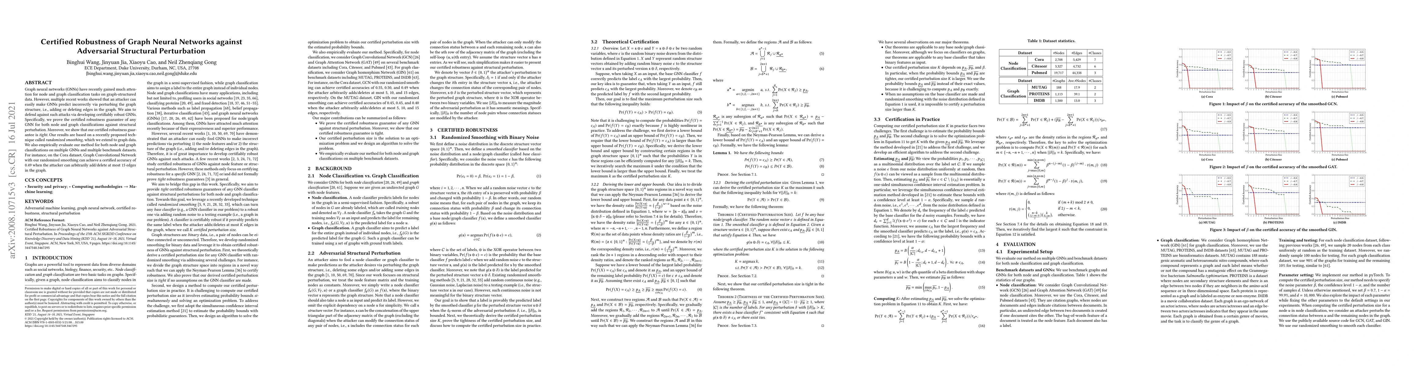 Graph neural networks (GNNs) have recently gained much attention for node and graph classification tasks on graph-structured data. However, multiple recent works showed that an attacker can easily make GNNs predict incorrectly via perturbing the graph structure, i.e., adding or deleting edges in the graph. We aim to defend against such attacks via developing certifiably robust GNNs. Specifically, we prove the certified robustness guarantee of any GNN for both node and graph classifications against structural perturbation. Moreover, we show that our certified robustness guarantee is tight. Our results are based on a recently proposed technique called randomized smoothing, which we extend to graph data. We also empirically evaluate our method for both node and graph classifications on multiple GNNs and multiple benchmark datasets. For instance, on the Cora dataset, Graph Convolutional Network with our randomized smoothing can achieve a certified accuracy of 0.49 when the attacker can arbitrarily add/delete at most 15 edges in the graph.