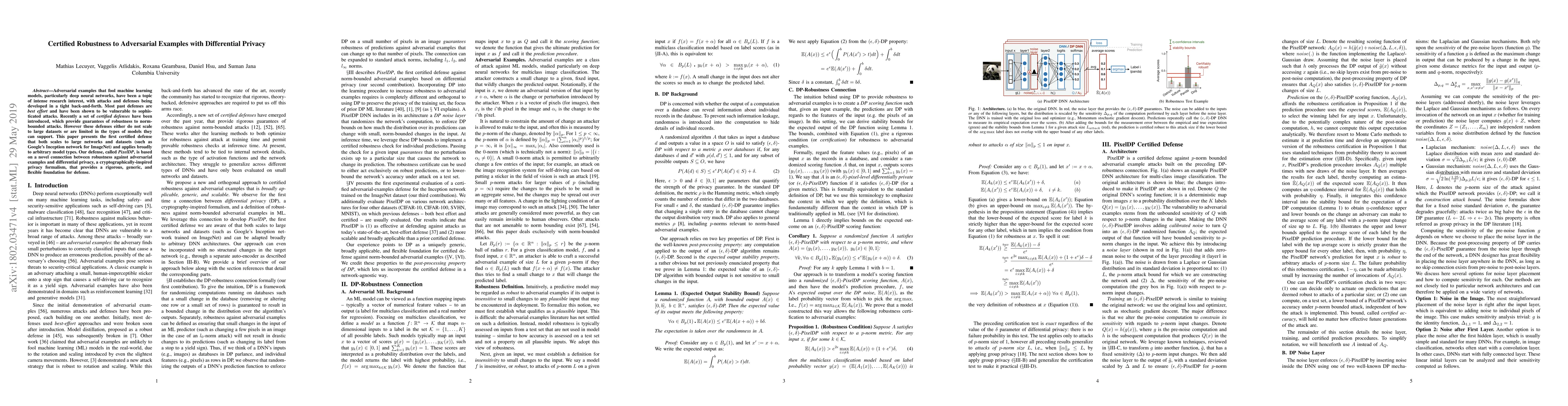 This paper introduces PixelDP, a certified defense mechanism that scales to large neural networks and datasets while providing robust guarantees against adversarial examples. It leverages differential privacy to offer a rigorous, flexible foundation for defending against norm-bounded attacks across various model types.