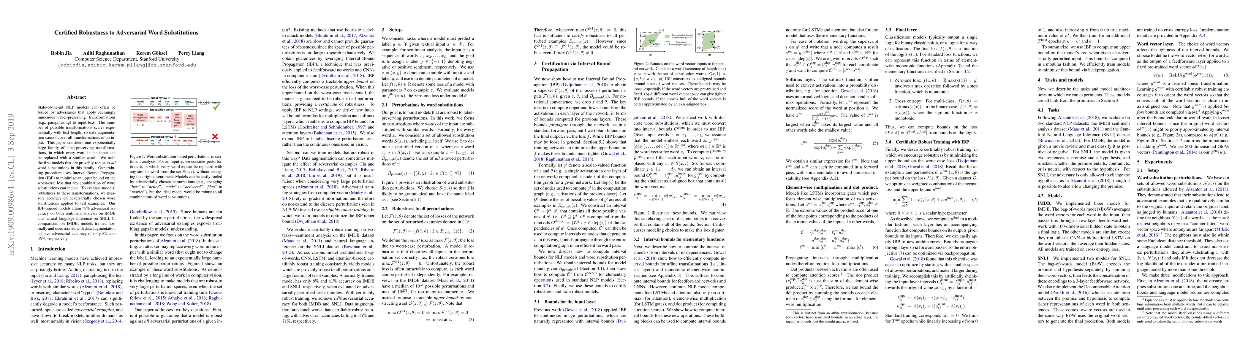 This paper develops robust NLP models that can withstand adversarial word substitutions by training with Interval Bound Propagation (IBP). The models achieve 75% adversarial accuracy on IMDB and SNLI, significantly outperforming non-robust models and those trained with data augmentation.