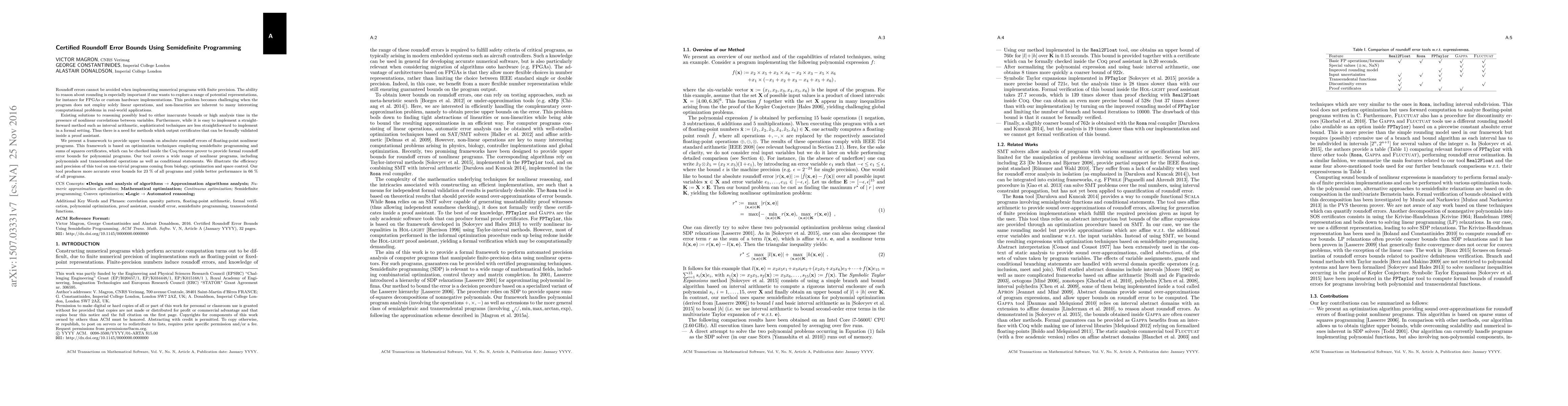 This paper presents a framework using semidefinite programming and sums of squares to provide certified upper bounds on roundoff errors in floating-point nonlinear programs, offering formal verification within the Coq theorem prover. The method achieves more accurate error bounds and better performance for a wide range of non-trivial programs.