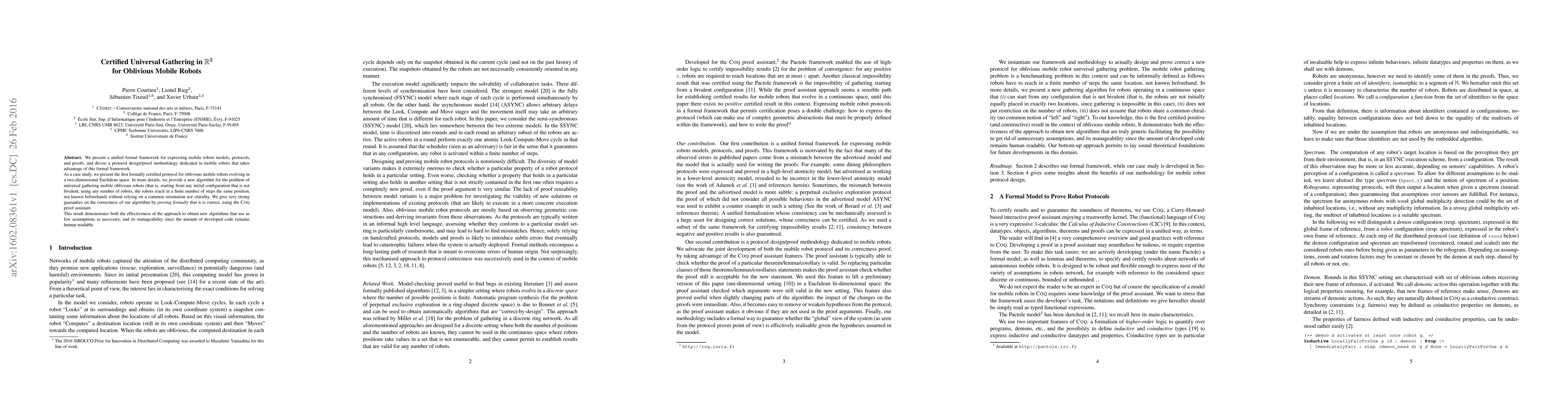 We present a unified formal framework for expressing mobile robots models, protocols, and proofs, and devise a protocol design/proof methodology dedicated to mobile robots that takes advantage of this formal framework. As a case study, we present the first formally certified protocol for oblivious mobile robots evolving in a two-dimensional Euclidean space. In more details, we provide a new algorithm for the problem of universal gathering mobile oblivious robots (that is, starting from any initial configuration that is not bivalent, using any number of robots, the robots reach in a finite number of steps the same position, not known beforehand) without relying on a common orientation nor chirality. We give very strong guaranties on the correctness of our algorithm by proving formally that it is correct, using the COQ proof assistant. This result demonstrates both the effectiveness of the approach to obtain new algorithms that use as few assumptions as necessary, and its manageability since the amount of developed code remains human readable.