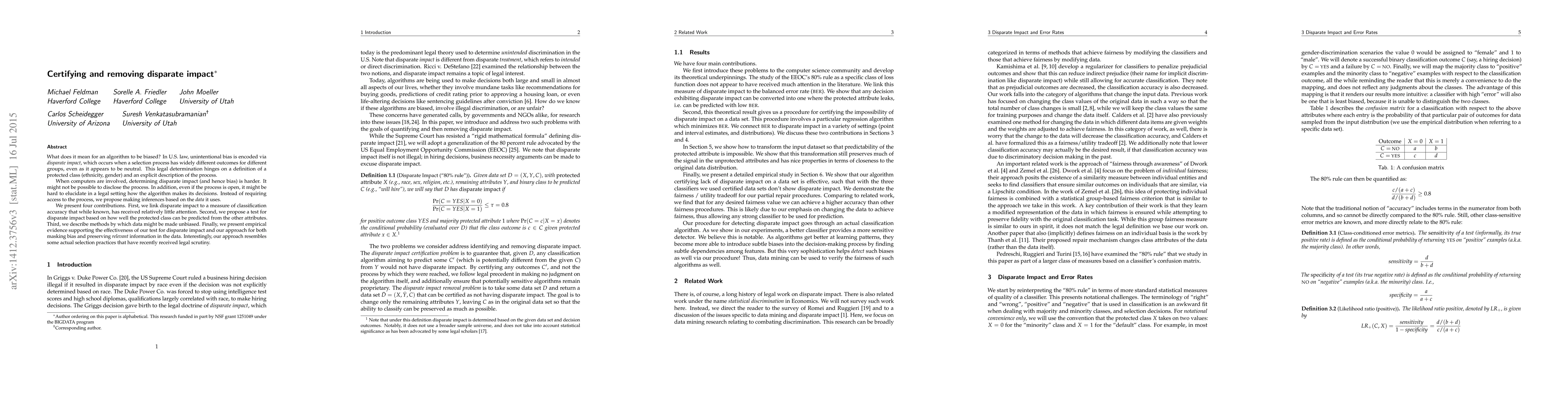 This paper proposes methods to certify and mitigate disparate impact in algorithmic decision-making by linking legal definitions to classification accuracy measures and introducing a test based on information leakage. It also describes techniques for making data unbiased and provides empirical evidence supporting its effectiveness.