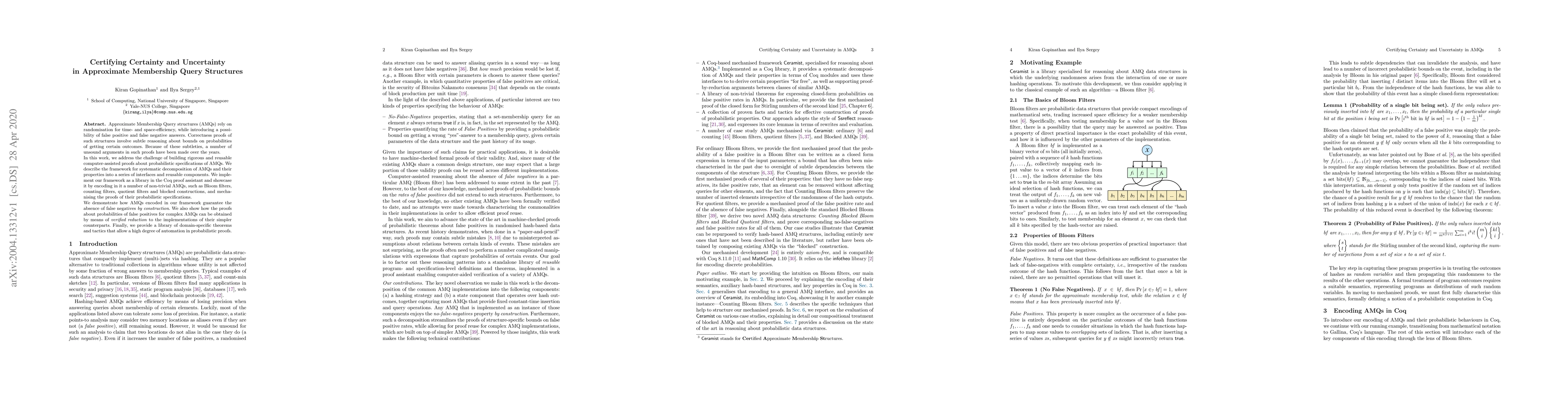 Approximate Membership Query structures (AMQs) rely on randomisation for time- and space-efficiency, while introducing a possibility of false positive and false negative answers. Correctness proofs of such structures involve subtle reasoning about bounds on probabilities of getting certain outcomes. Because of these subtleties, a number of unsound arguments in such proofs have been made over the years. In this work, we address the challenge of building rigorous and reusable computer-assisted proofs about probabilistic specifications of AMQs. We describe the framework for systematic decomposition of AMQs and their properties into a series of interfaces and reusable components. We implement our framework as a library in the Coq proof assistant and showcase it by encoding in it a number of non-trivial AMQs, such as Bloom filters, counting filters, quotient filters and blocked constructions, and mechanising the proofs of their probabilistic specifications. We demonstrate how AMQs encoded in our framework guarantee the absence of false negatives by construction. We also show how the proofs about probabilities of false positives for complex AMQs can be obtained by means of verified reduction to the implementations of their simpler counterparts. Finally, we provide a library of domain-specific theorems and tactics that allow a high degree of automation in probabilistic proofs.
