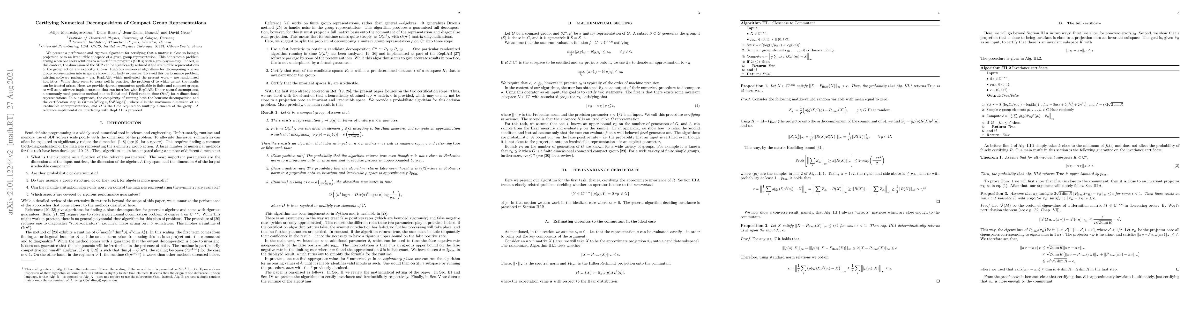 We present a performant and rigorous algorithm for certifying that a matrix is close to being a projection onto an irreducible subspace of a given group representation. This addresses a problem arising when one seeks solutions to semi-definite programs (SDPs) with a group symmetry. Indeed, in this context, the dimension of the SDP can be significantly reduced if the irreducible representations of the group action are explicitly known. Rigorous numerical algorithms for decomposing a given group representation into irreps are known, but fairly expensive. To avoid this performance problem, existing software packages -- e.g. RepLAB, which motivated the present work -- use randomized heuristics. While these seem to work well in practice, the problem of to which extent the results can be trusted arises. Here, we provide rigorous guarantees applicable to finite and compact groups, as well as a software implementation that can interface with RepLAB. Under natural assumptions, a commonly used previous method due to Babai and Friedl runs in time O(n^5) for n-dimensional representations. In our approach, the complexity of running both the heuristic decomposition and the certification step is O(max{n^3 log n, D d^2 log d}), where d is the maximum dimension of an irreducible subrepresentation, and D is the time required to multiply elements of the group. A reference implementation interfacing with RepLAB is provided.