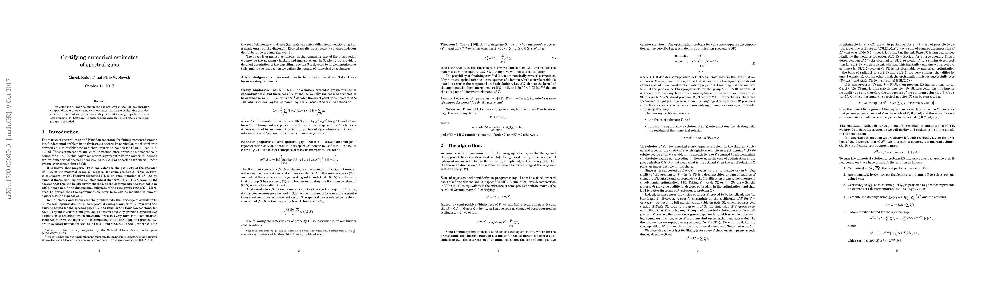 We establish a lower bound on the spectral gap of the Laplace operator on special linear groups using conic optimisation. In particular, this provides a constructive (but computer assisted) proof that these groups have Kazhdan property (T). A software for such optimisation for other finitely presented groups is provided.
