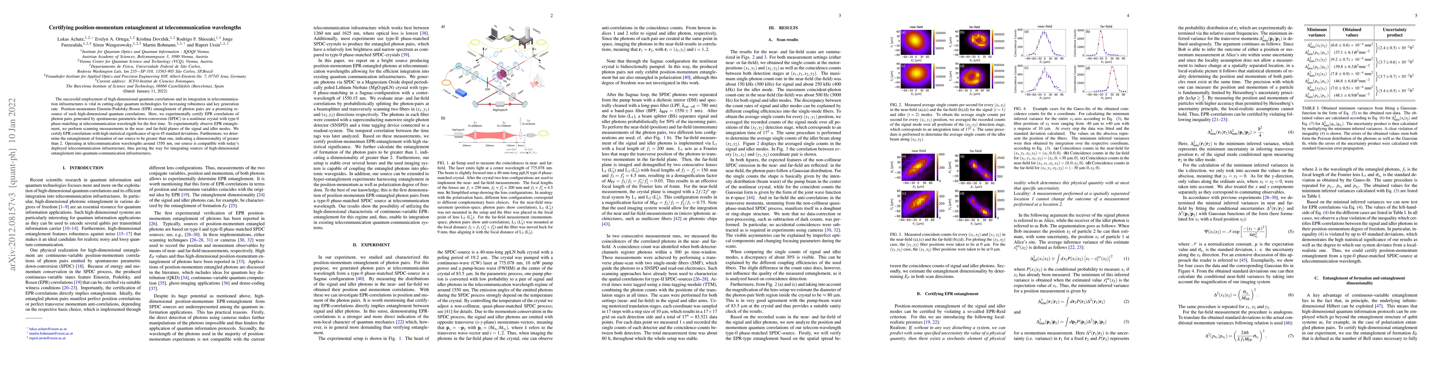 This paper certifies position-momentum Einstein-Podolsky-Rosen (EPR) entanglement in photon pairs generated by SPDC at telecommunication wavelengths, demonstrating high-dimensional quantum correlations crucial for advanced quantum technologies. The experiment shows entanglement with over 45 standard deviations, indicating compatibility with current telecom infrastructure.