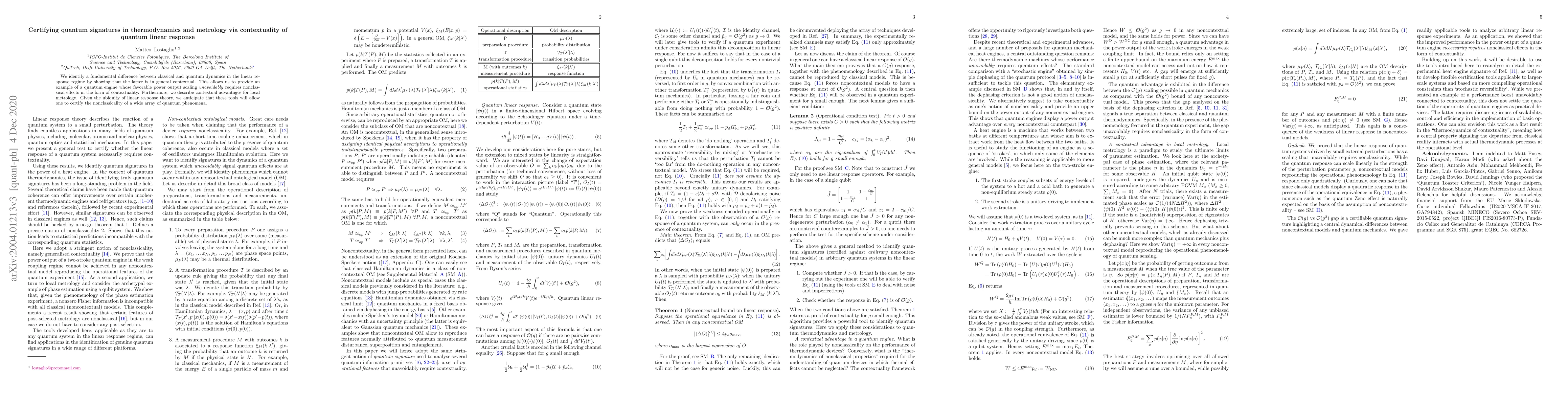 We identify a fundamental difference between classical and quantum dynamics in the linear response regime by showing that the latter is in general contextual. This allows us to provide an example of a quantum engine whose favorable power output scaling \emph{unavoidably} requires nonclassical effects in the form of contextuality. Furthermore, we describe contextual advantages for local metrology. Given the ubiquity of linear response theory, we anticipate that these tools will allow one to certify the nonclassicality of a wide array of quantum phenomena.