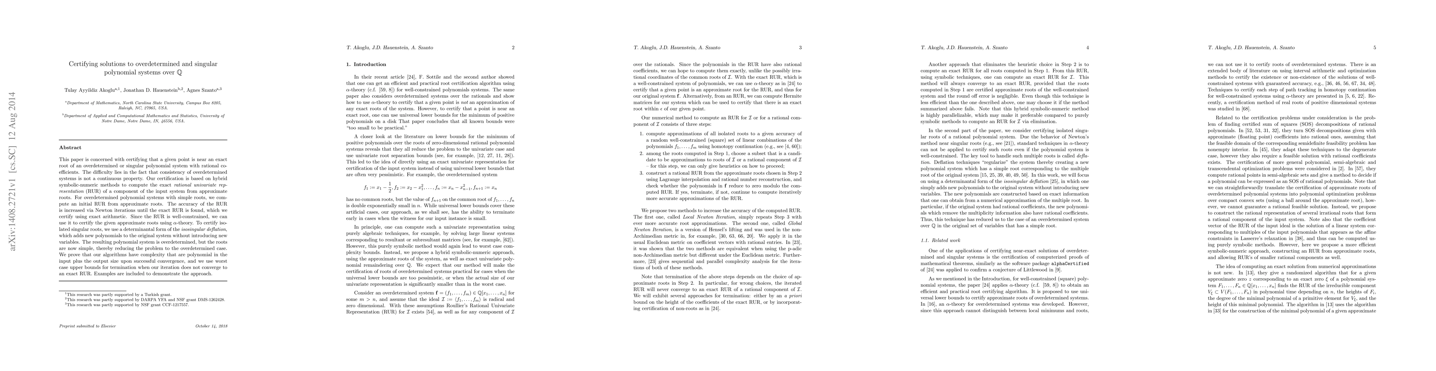This paper presents a method to certify near exact roots for overdetermined and singular polynomial systems with rational coefficients, using hybrid symbolic-numeric methods and alpha-theory.