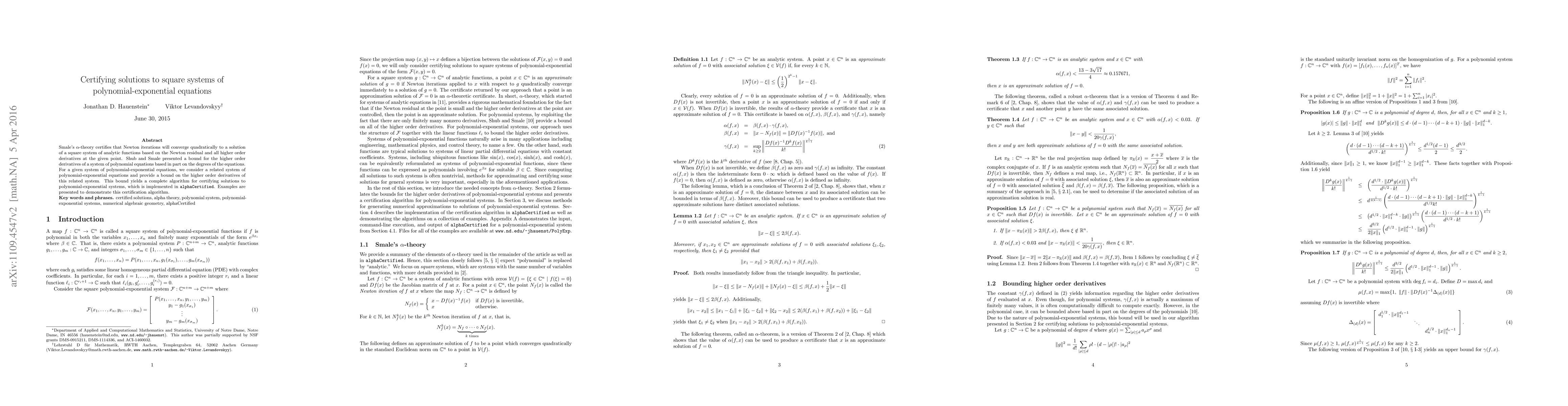 This research introduces a certification algorithm for solving square systems of polynomial-exponential equations, building on Smale's alpha-theory and Shub & Smale's work. It provides bounds for higher-order derivatives of such systems, enabling verifiable quadratic convergence of Newton iterations, with examples and implementation in alphaCertified.