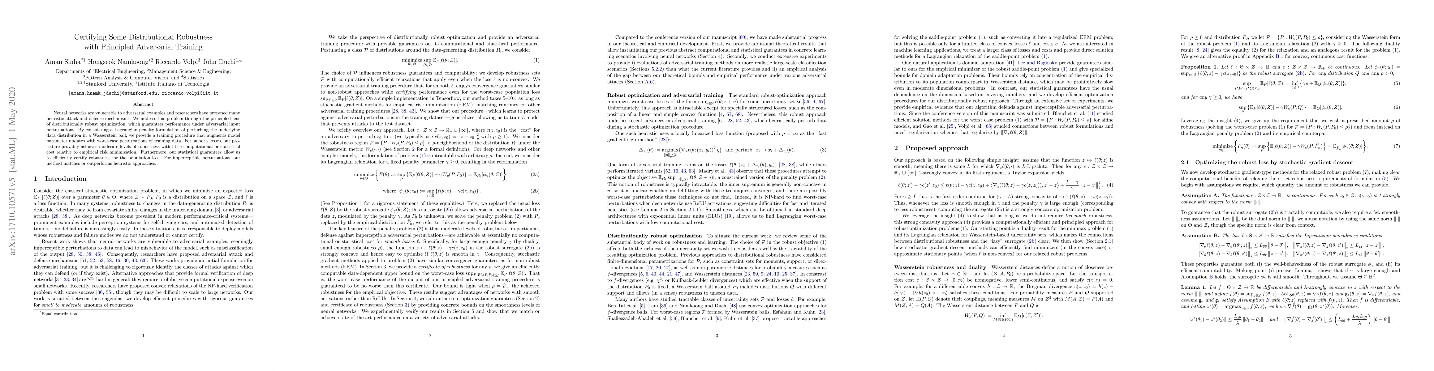 Neural networks are vulnerable to adversarial examples and researchers have proposed many heuristic attack and defense mechanisms. We address this problem through the principled lens of distributionally robust optimization, which guarantees performance under adversarial input perturbations. By considering a Lagrangian penalty formulation of perturbing the underlying data distribution in a Wasserstein ball, we provide a training procedure that augments model parameter updates with worst-case perturbations of training data. For smooth losses, our procedure provably achieves moderate levels of robustness with little computational or statistical cost relative to empirical risk minimization. Furthermore, our statistical guarantees allow us to efficiently certify robustness for the population loss. For imperceptible perturbations, our method matches or outperforms heuristic approaches.