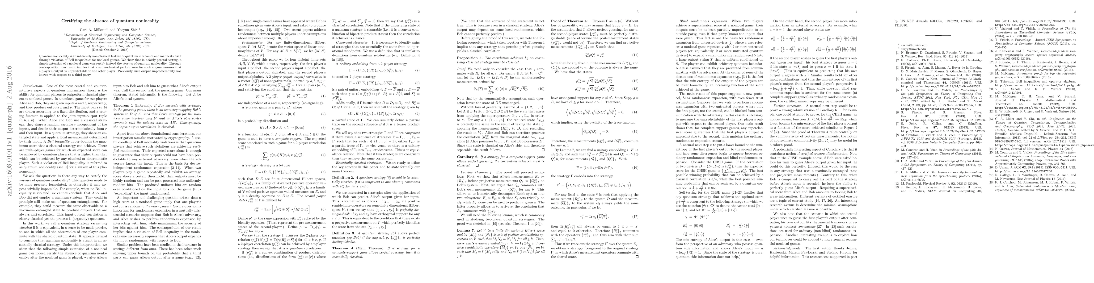 This paper demonstrates how a modified nonlocal game can certify the absence of quantum nonlocality, implying that super-classical performance in such games ensures output unpredictability between players, previously only guaranteed with respect to a third party.