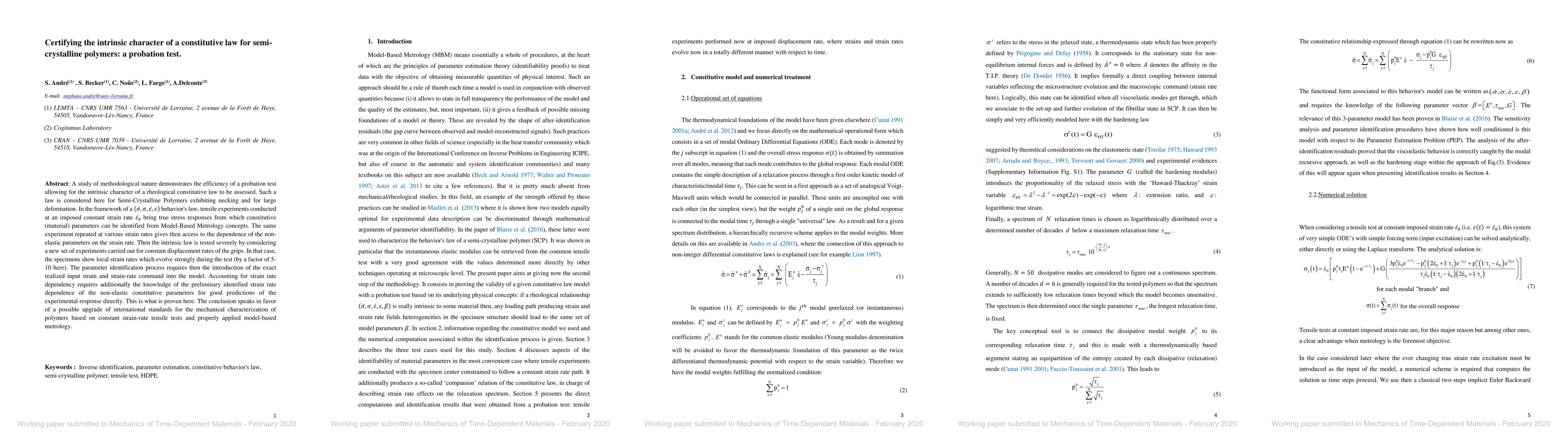 This study proposes a probation test to certify the intrinsic character of a constitutive law for semi-crystalline polymers under large deformation. The test validates the dependency of non-elastic parameters on strain rate, demonstrating the potential for upgrading international standards for polymer mechanical characterization.