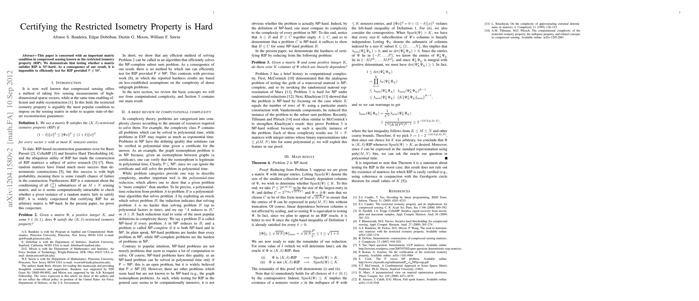The result shows that testing whether a matrix satisfies the restricted isometry property is hard, making it impossible to efficiently test for RIP provided P ≠ NP.