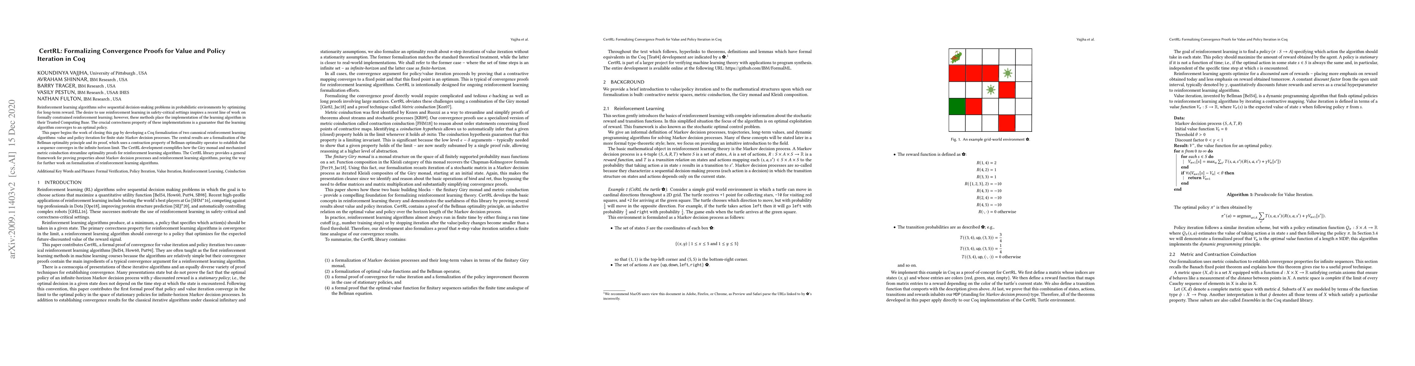 Reinforcement learning algorithms solve sequential decision-making problems in probabilistic environments by optimizing for long-term reward. The desire to use reinforcement learning in safety-critical settings inspires a recent line of work on formally constrained reinforcement learning; however, these methods place the implementation of the learning algorithm in their Trusted Computing Base. The crucial correctness property of these implementations is a guarantee that the learning algorithm converges to an optimal policy. This paper begins the work of closing this gap by developing a Coq formalization of two canonical reinforcement learning algorithms: value and policy iteration for finite state Markov decision processes. The central results are a formalization of Bellman's optimality principle and its proof, which uses a contraction property of Bellman optimality operator to establish that a sequence converges in the infinite horizon limit. The CertRL development exemplifies how the Giry monad and mechanized metric coinduction streamline optimality proofs for reinforcement learning algorithms. The CertRL library provides a general framework for proving properties about Markov decision processes and reinforcement learning algorithms, paving the way for further work on formalization of reinforcement learning algorithms.