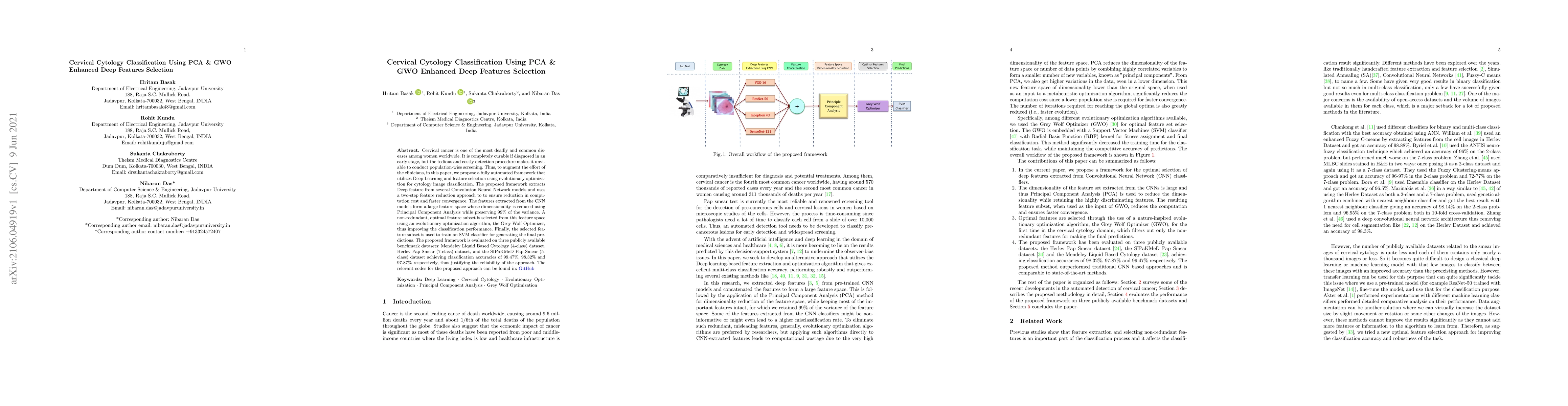 This research paper proposes a fully automated framework for cervical cytology classification using deep learning and evolutionary optimization. The framework employs Convolutional Neural Networks to extract features, reduces dimensionality with Principal Component Analysis, and selects optimal features using the Grey Wolf Optimizer to enhance classification performance. An SVM classifier is trained with the selected features, achieving high classification accuracies on three benchmark datasets. The relevant codes are available for further exploration and validation.