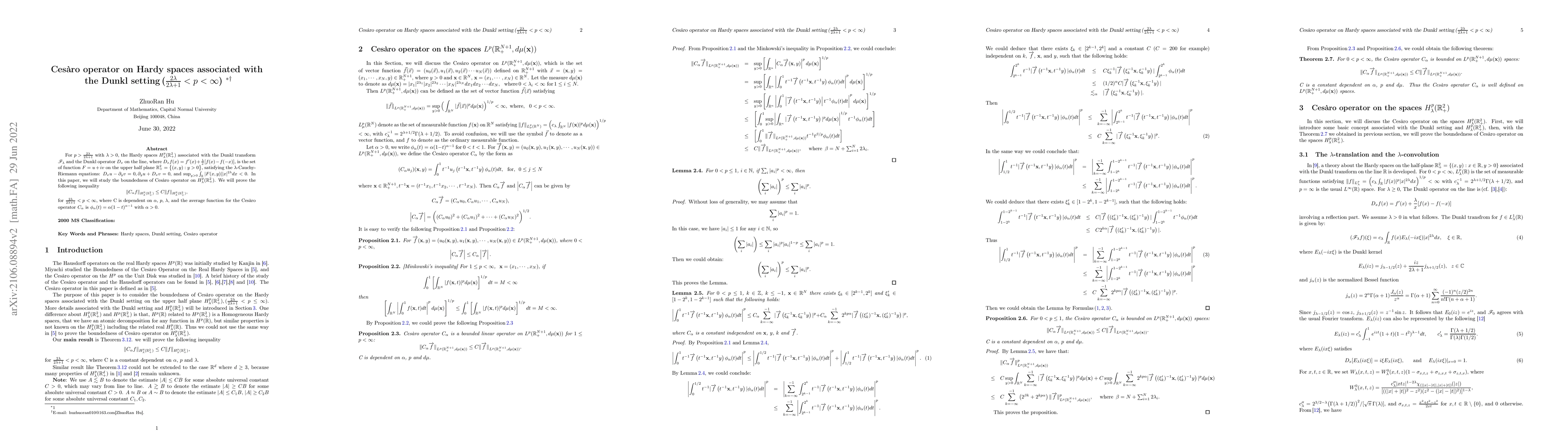 For $p>\frac{2\lambda}{2\lambda+1}$ with $\lambda>0$, the Hardy spaces $H_{\lambda}^{p}(\mathbb{R}^{2}_+)$ associated with the Dunkl transform $\mathscr{F}_\lambda$ and the Dunkl operator $D_x$ on the line, where $D_xf(x)=f'(x)+\frac{\lambda}{x}[f(x)-f(-x)]$, is the set of function $F=u+iv$ on the upper half plane $\mathbb{R}_+^2=\big\{(x, y): y>0\big\}$, satisfying the $\lambda$-Cauchy-Riemann equations: $D_xu-\partial_y v=0, \partial_y u +D_xv=0$, and $\sup_{y>0}\int_{\mathbb{R}}|F(x, y)||x|^{2\lambda}dx<0$. In this paper, we will study the boundedness of Ces\`{a}ro operator on $H_{\lambda}^{p}(\mathbb{R}^{2}_+)$. We will prove the following inequality $$ \|C_{\alpha}f\|_{H_{\lambda}^p(\mathbb{R}_+^2)}\leq C\|f\|_{H_{\lambda}^p(v_+^2)},$$ for $\frac{2\lambda}{2\lambda+1}< p<\infty$, where C is dependent on $\alpha$, $p$, $\lambda$, and the average function for the Ces\`{a}ro operator $C_{\alpha}$ is $\phi_{\alpha}(t)=\alpha(1-t)^{\alpha-1}$ with $\alpha>0$.